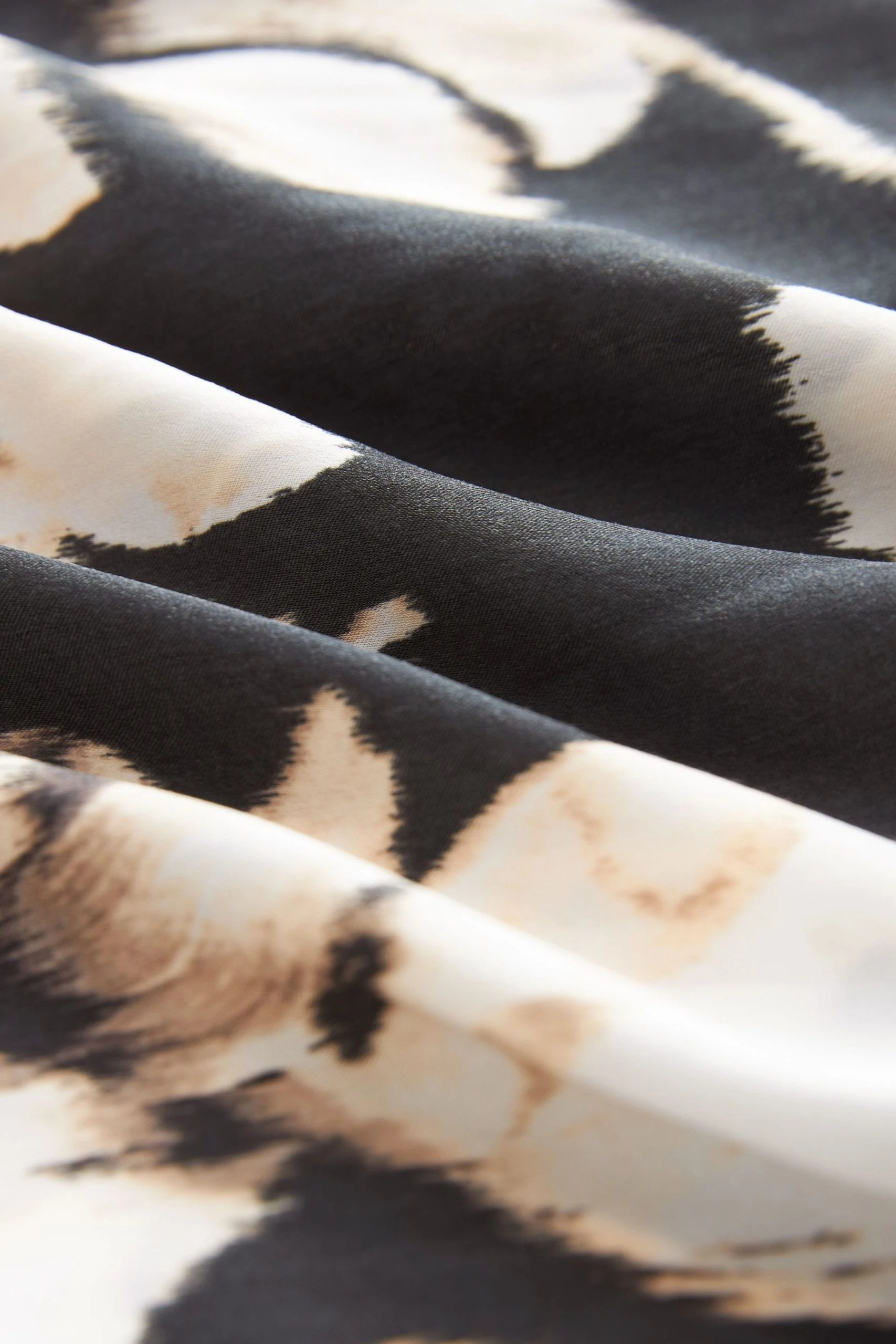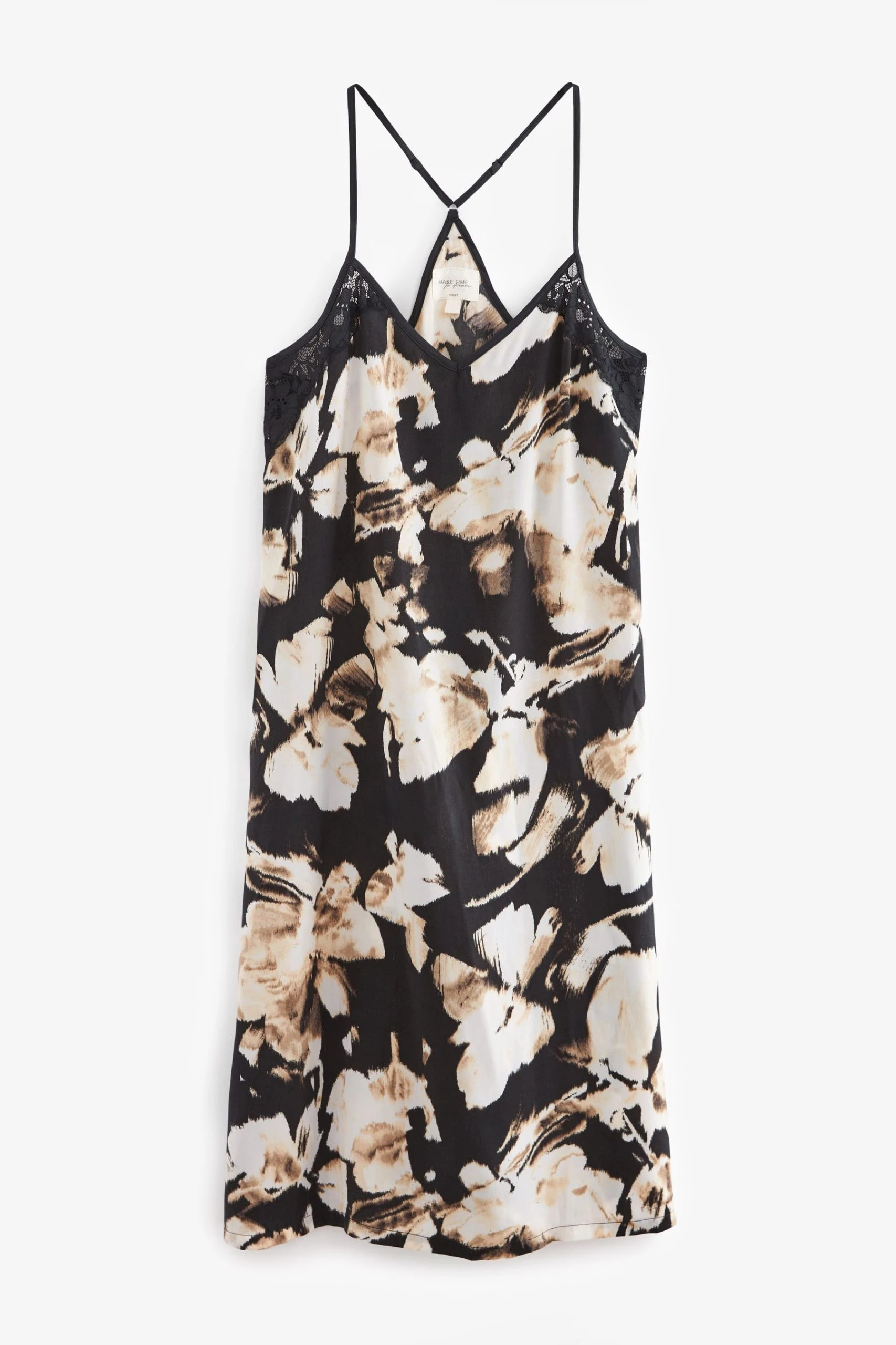 Satin. Floral print. Plunge neckline. Lace panels on the front. Adjustable straps. Matching robe.