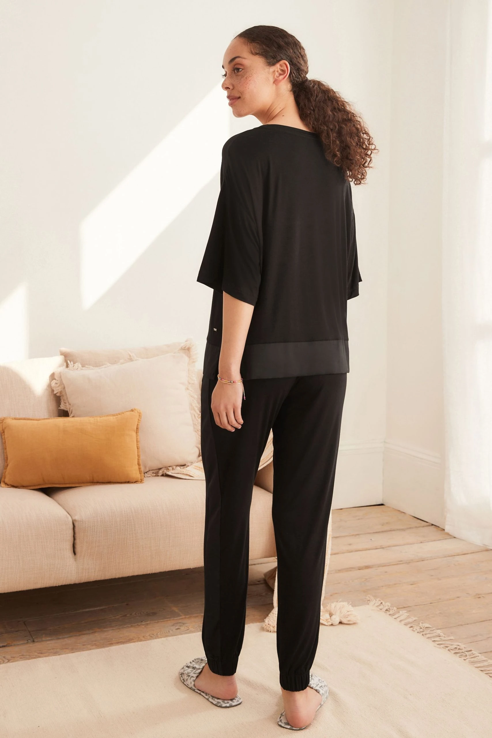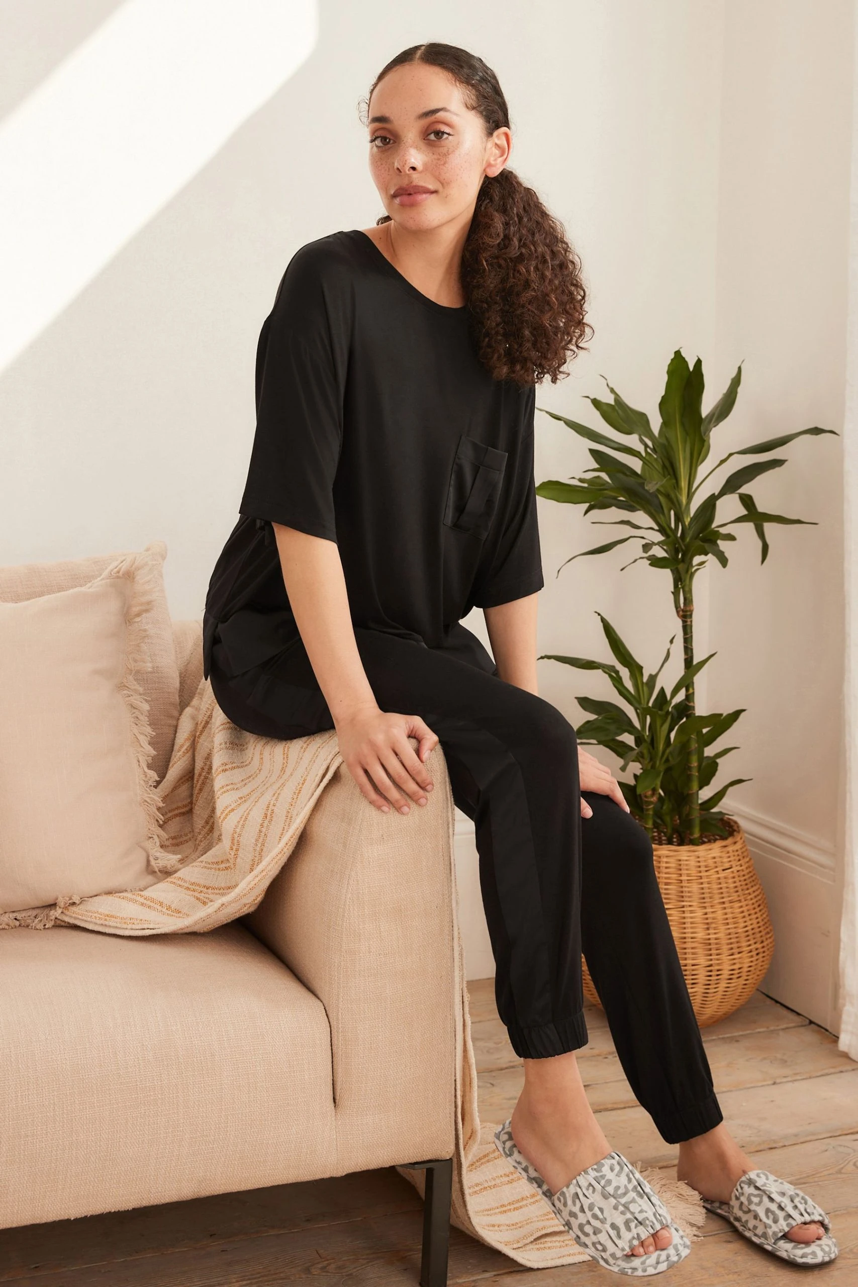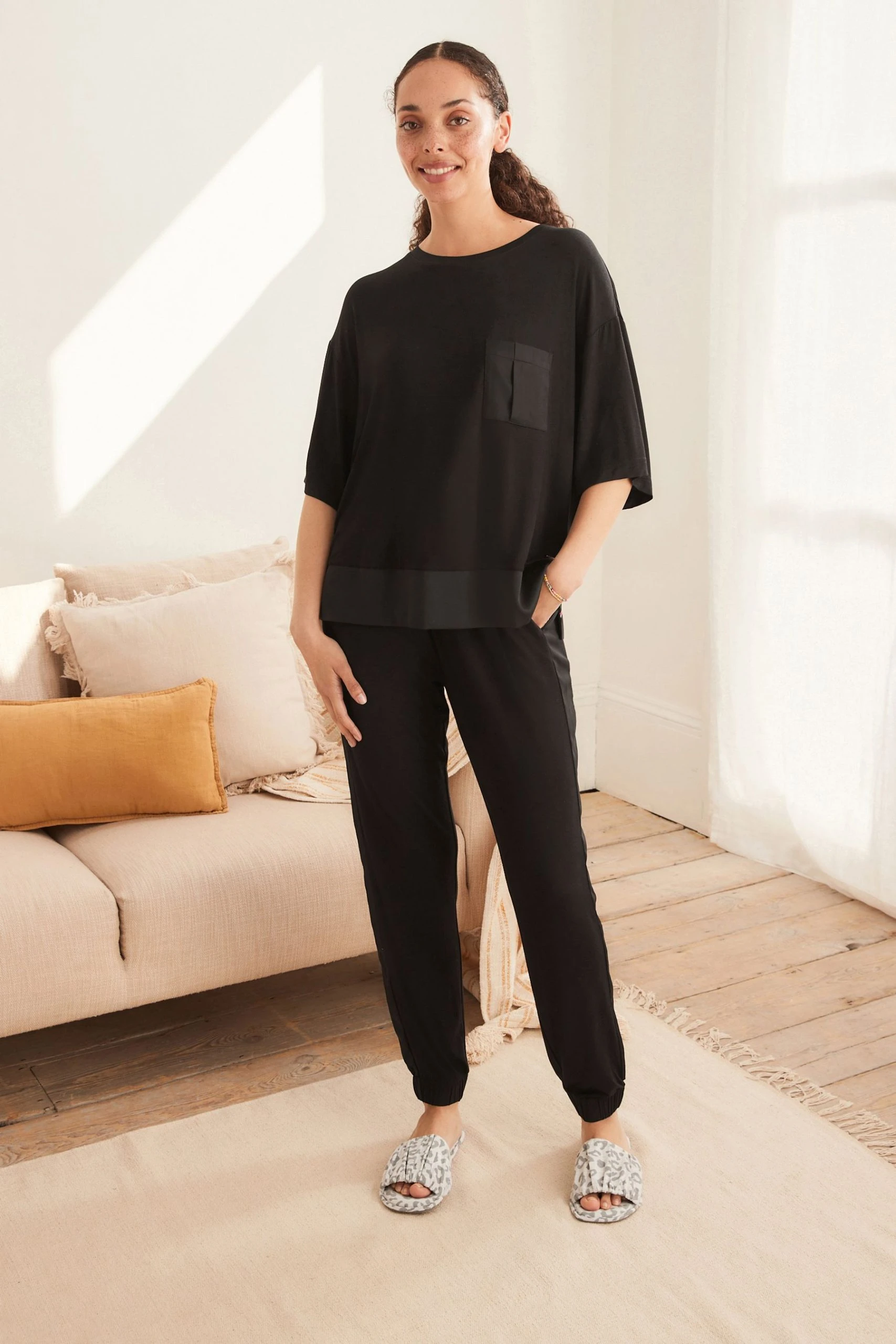 In a supersoft mix of jersey and woven fabrics, these pyjamas include a laid-back top and matching bottoms with side pockets. Featuring satin trim detailing for some added style.