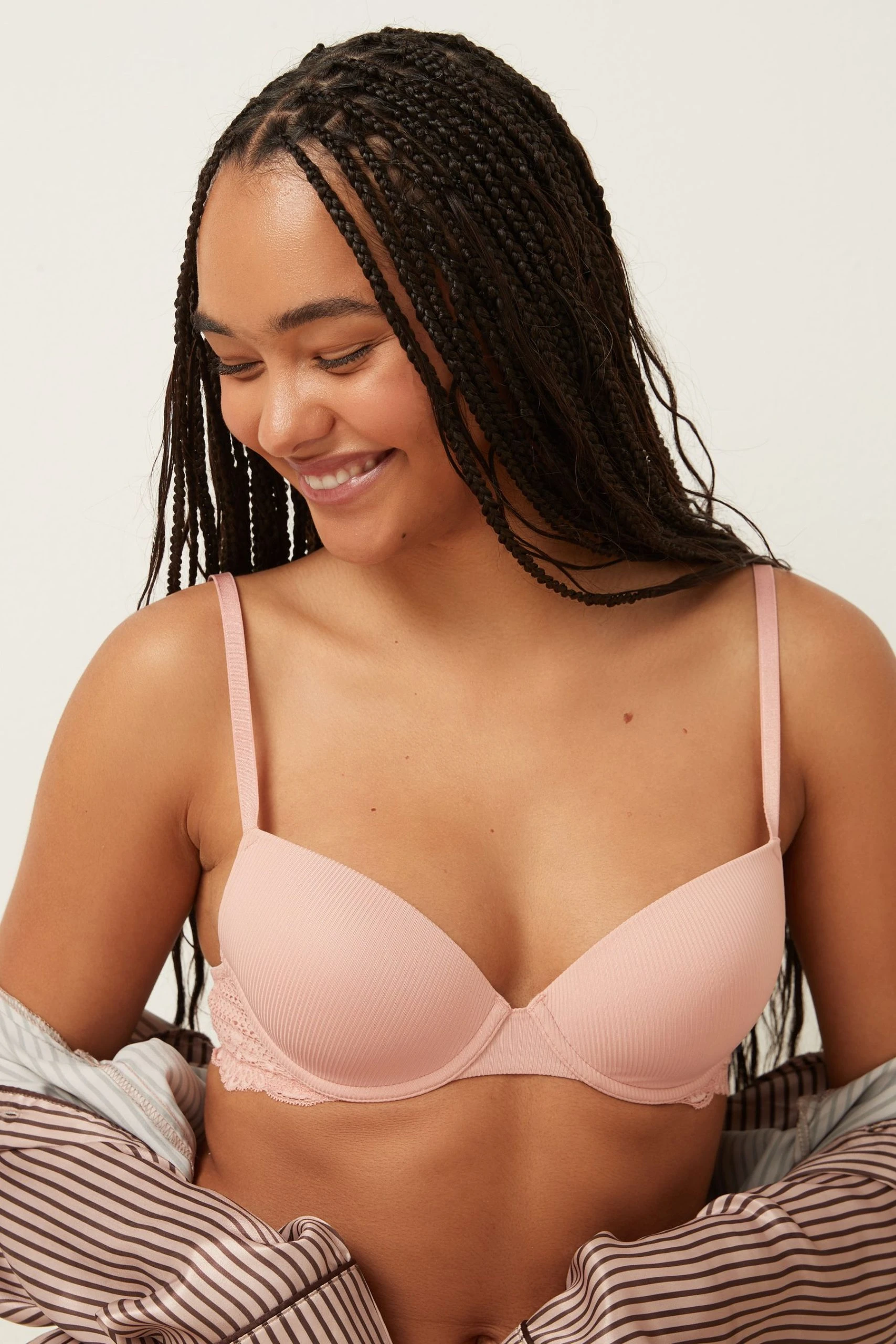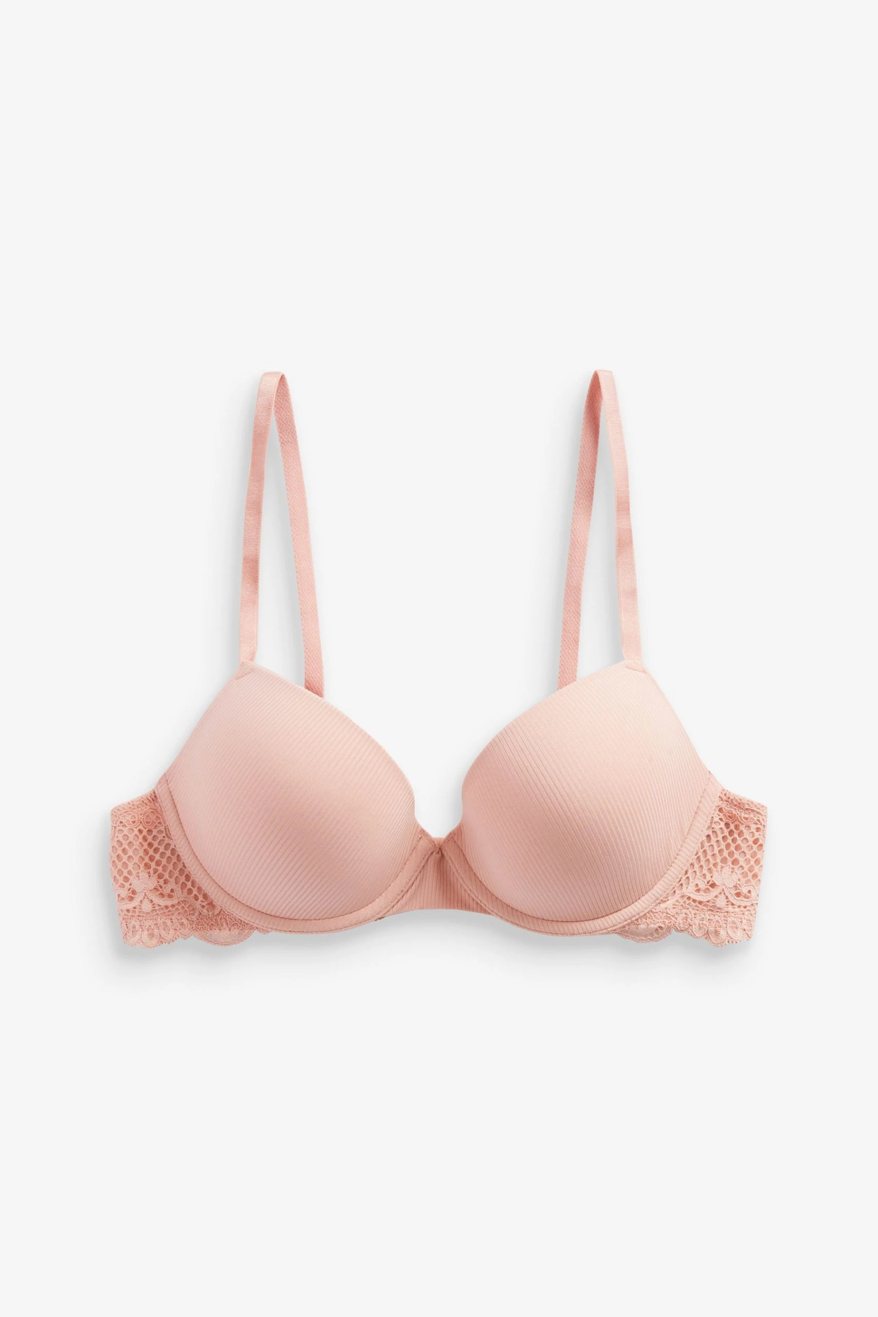 Our two pack rib and lace bras are perfect for everyday wear. In a plunge shape with light padding they feature rib fabric with lace detailing for a feminine touch.