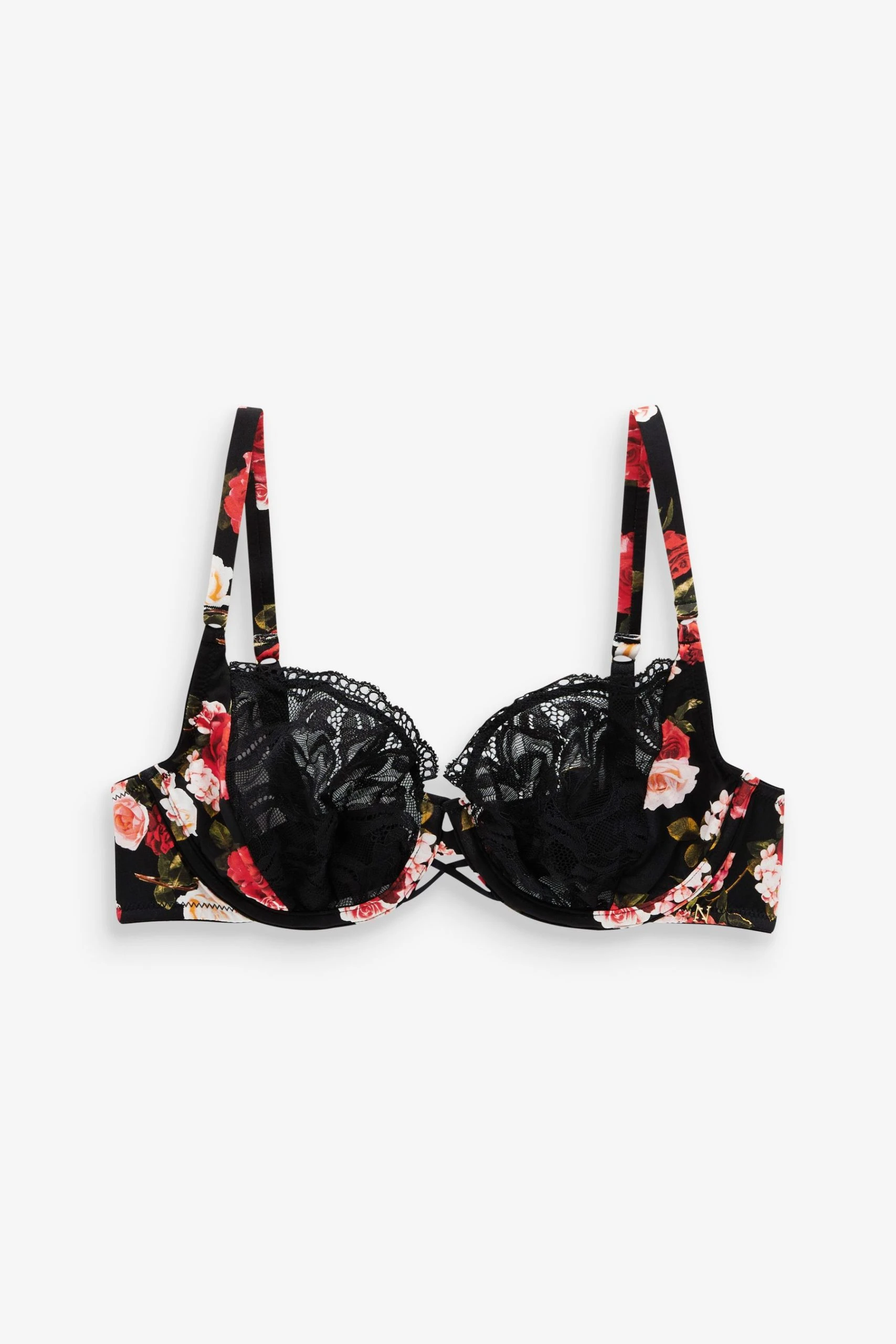 Next Black/Red Rose Floral Print & Lace Bra