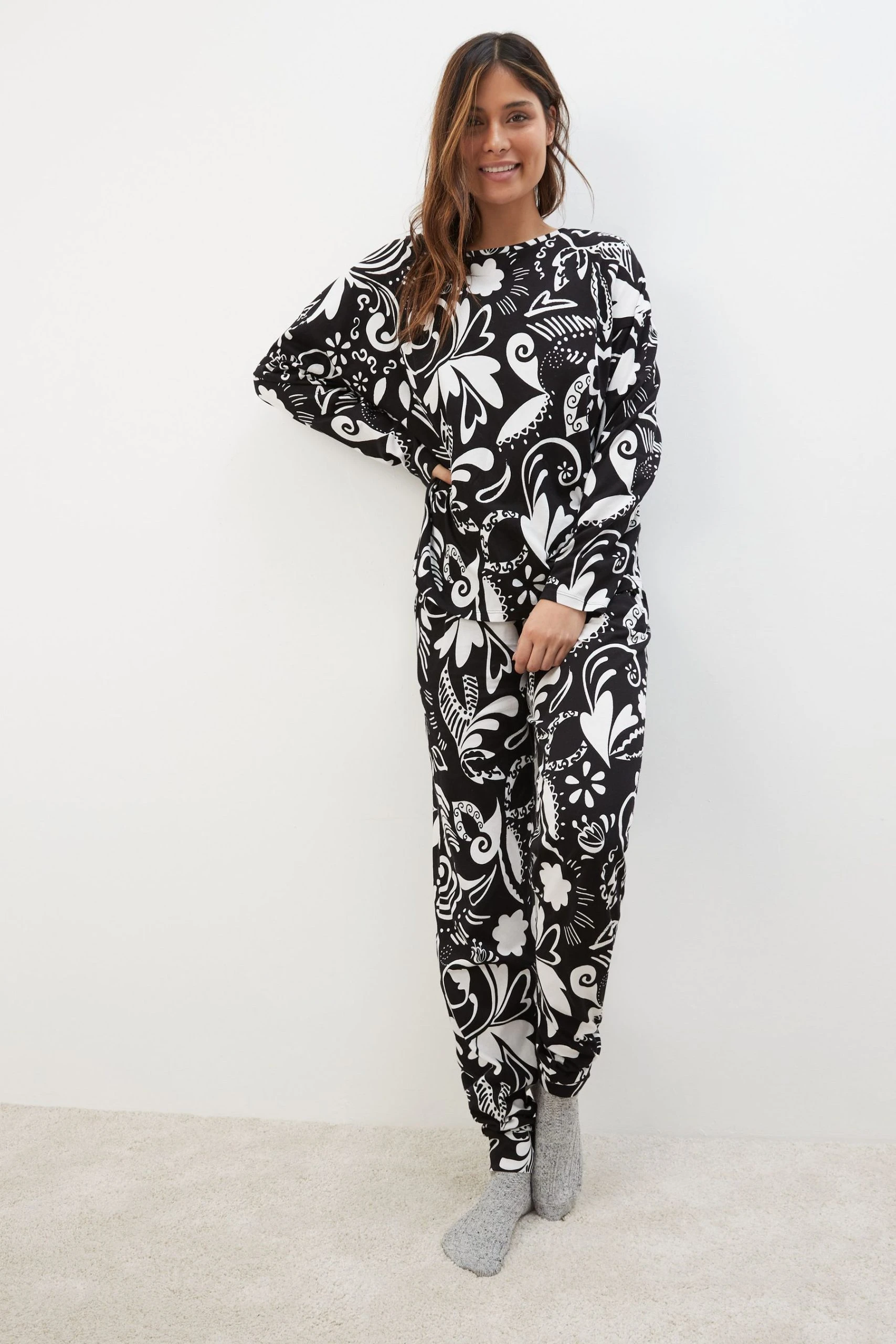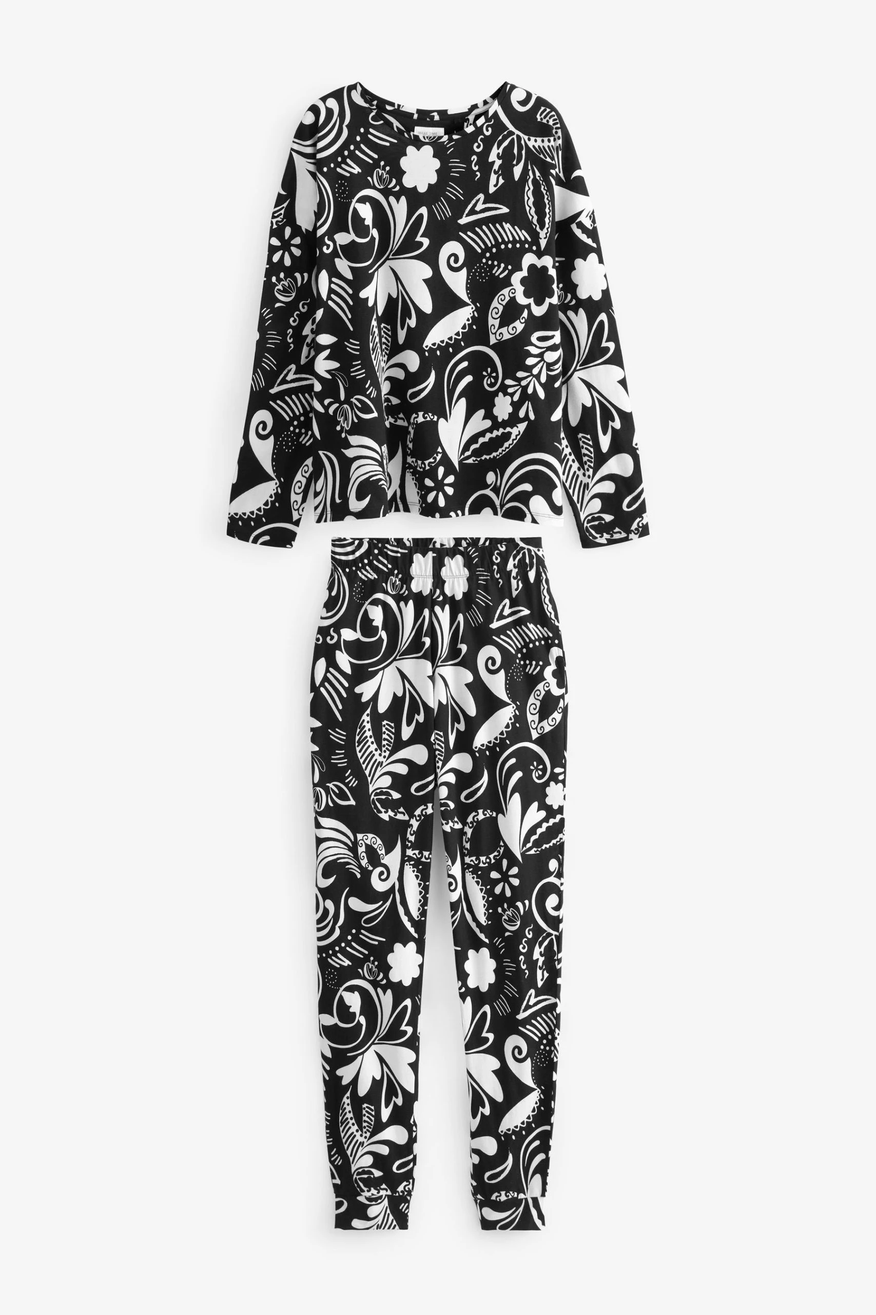 2Piece set. Allover leaf print. Long sleeve T-Shirt. Crew neck. Pyjamas with elasticated waist. 100% Cotton.