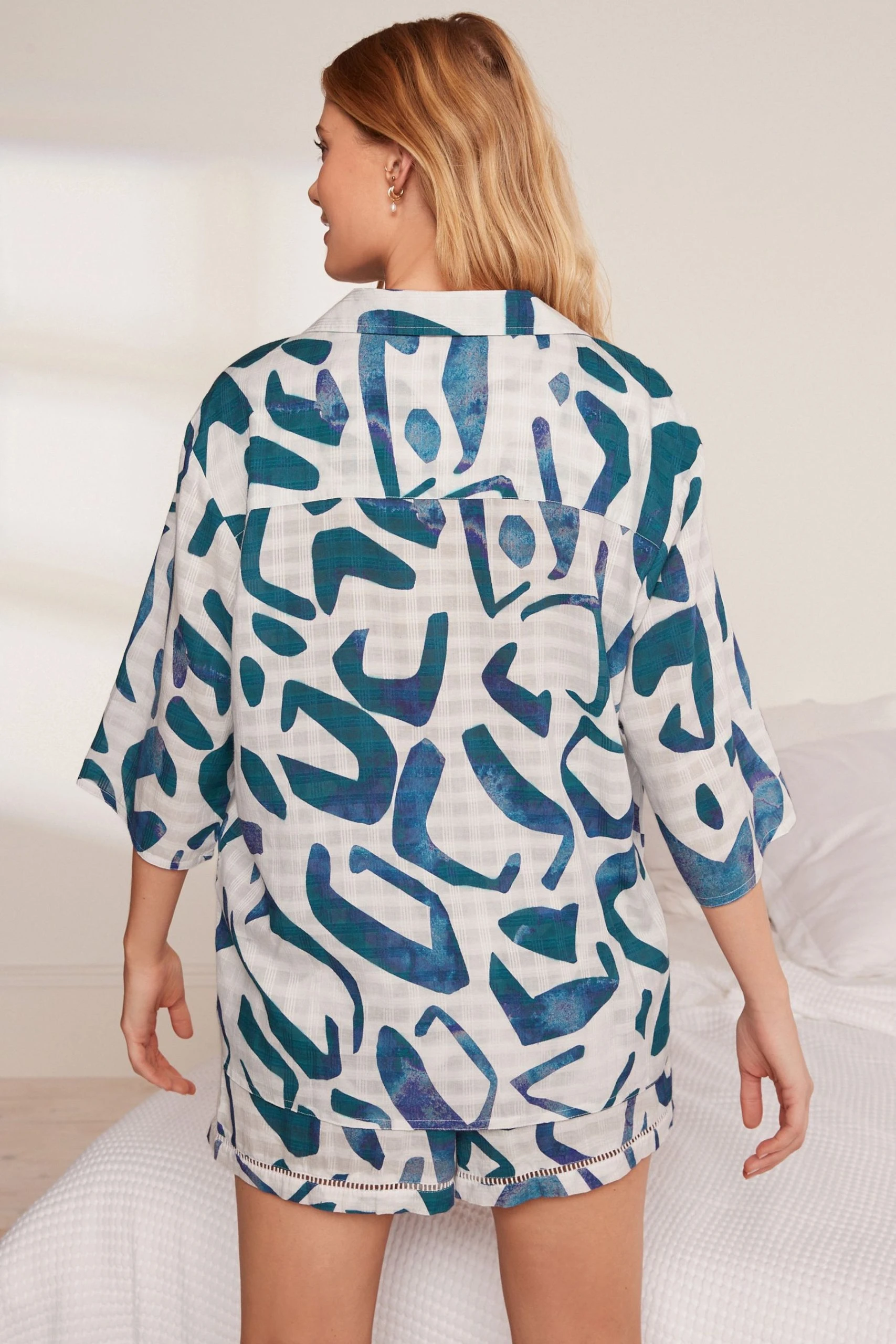 Collared. Button fastening front. ¾ Sleeves. Elasticated waistband in shorts with drawcord. Ladder trim detail at shoulder and short s hem.