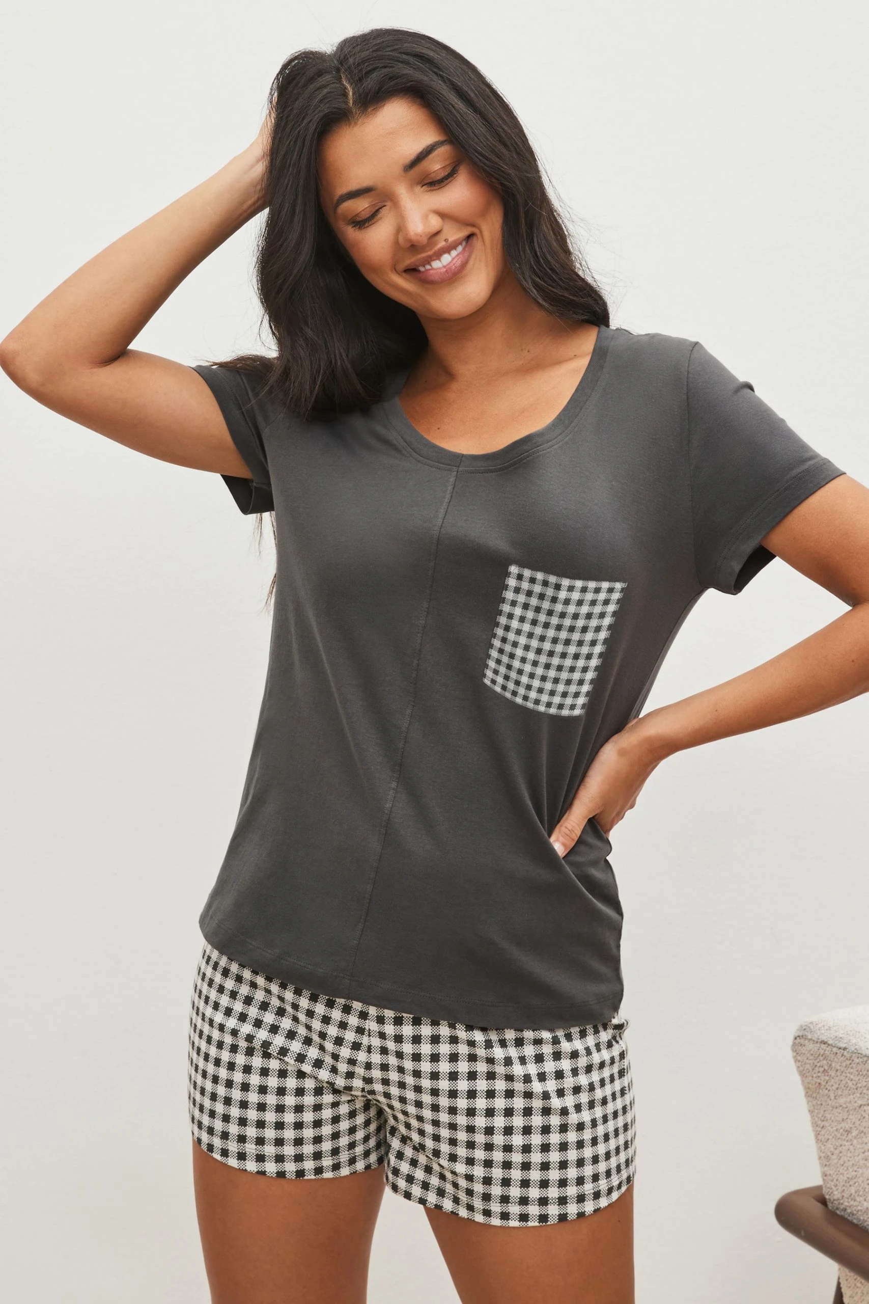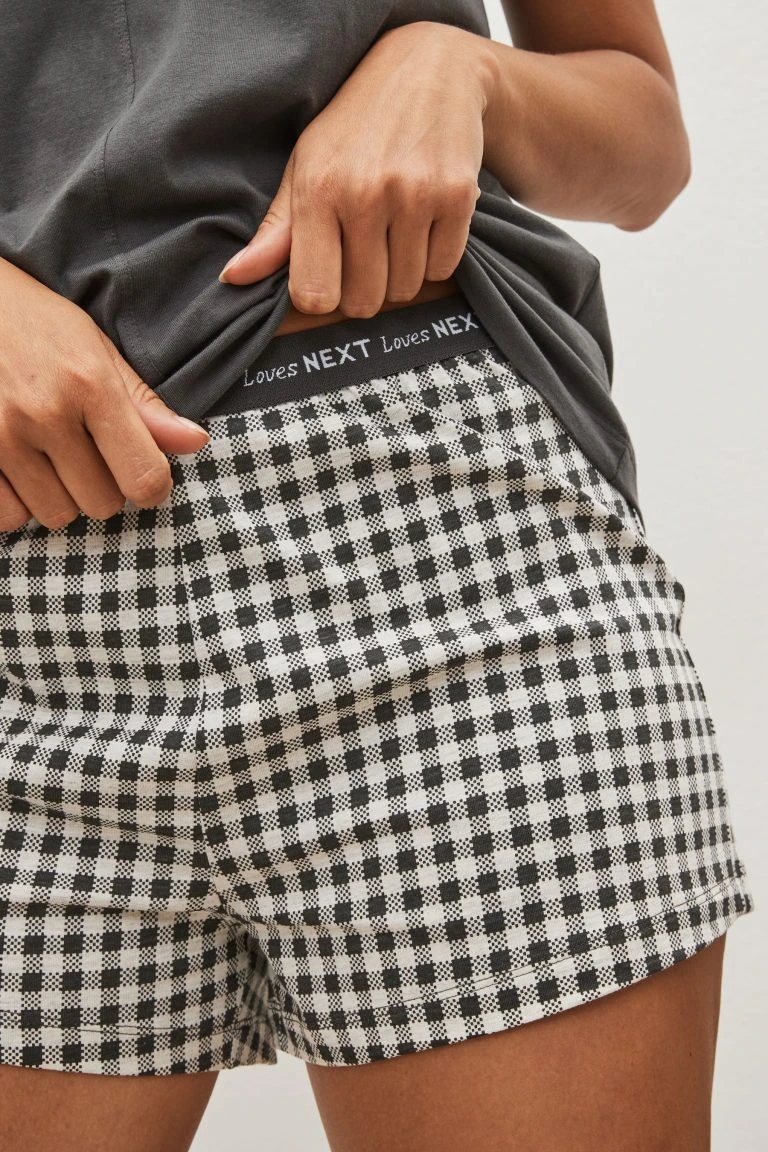Next Charcoal Grey Gingham Cotton Short Sleeve Pyjamas
