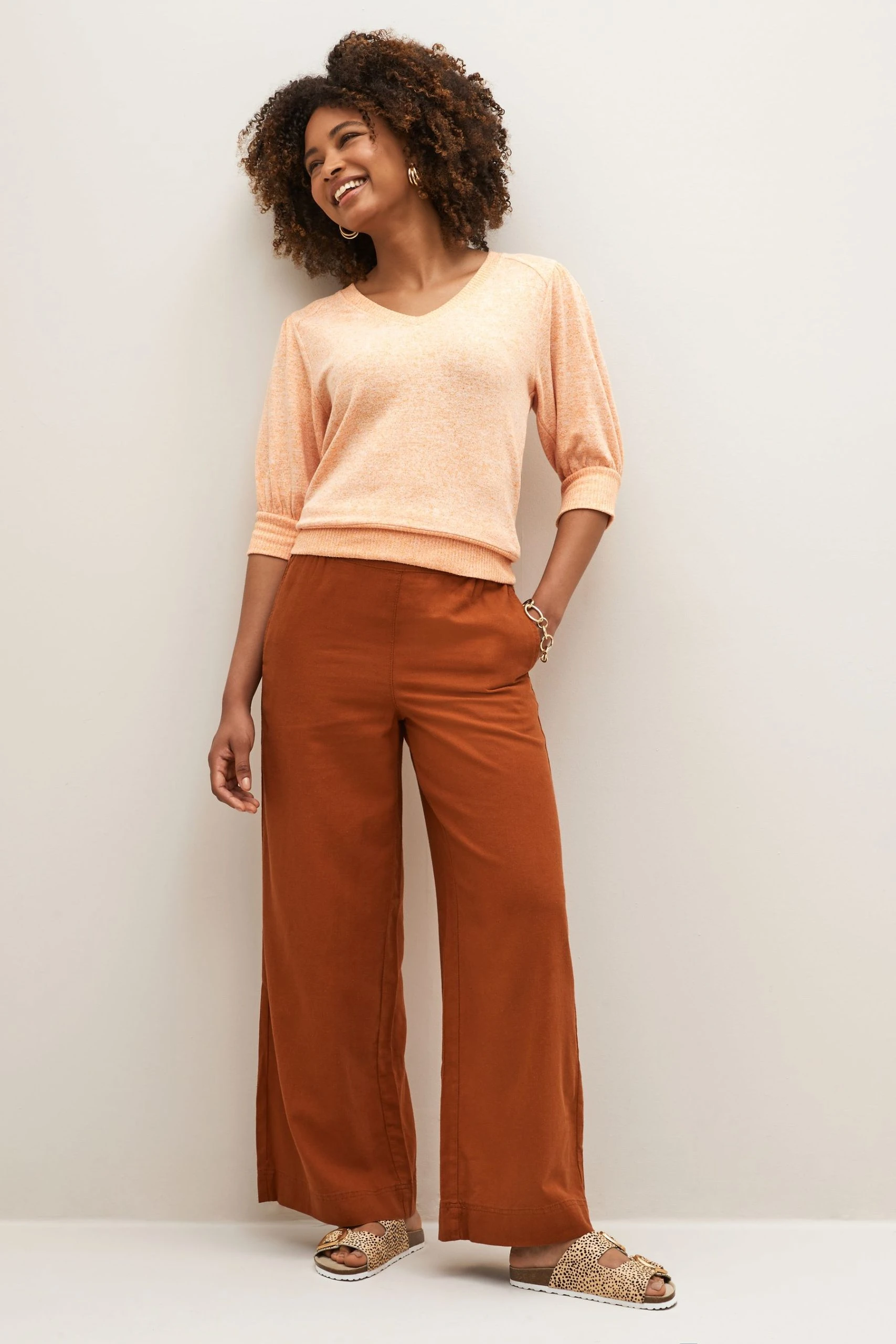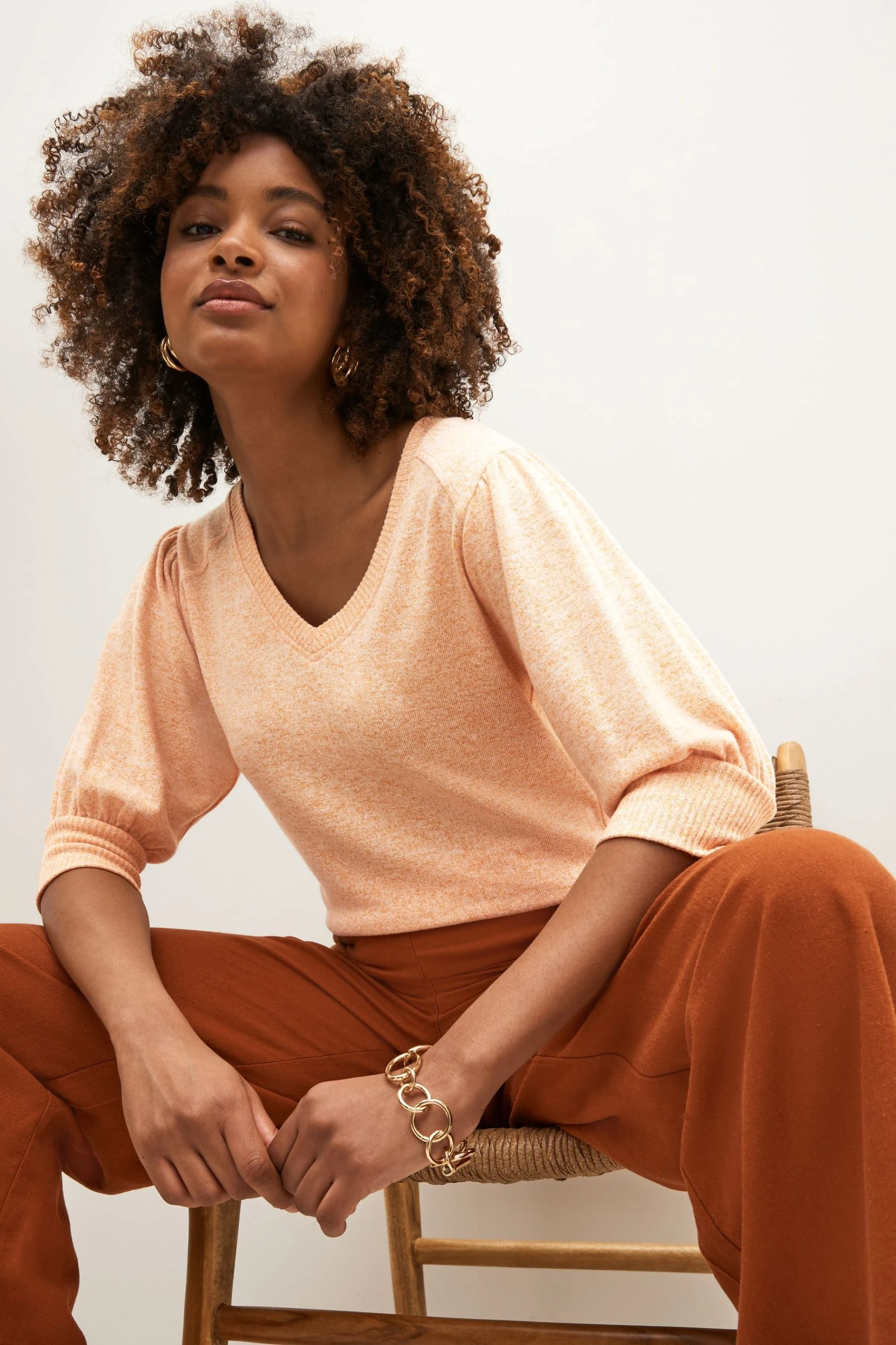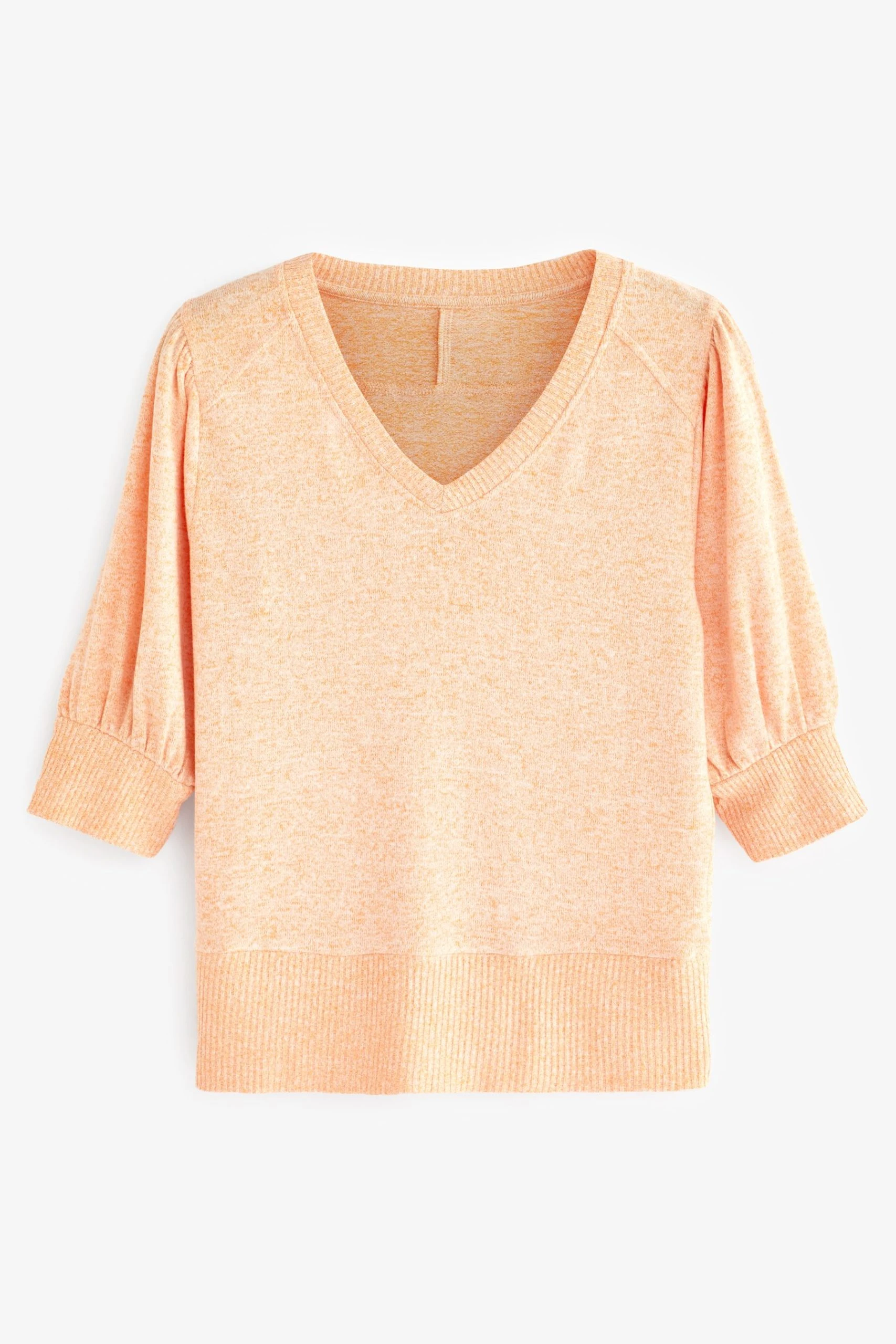 It’s lightweight enough that it won’t weigh us down, while the soft jersey fabric means it still has that cosy feel. Deep V-Neck. Ribbed trim finish. Puff sleeve.