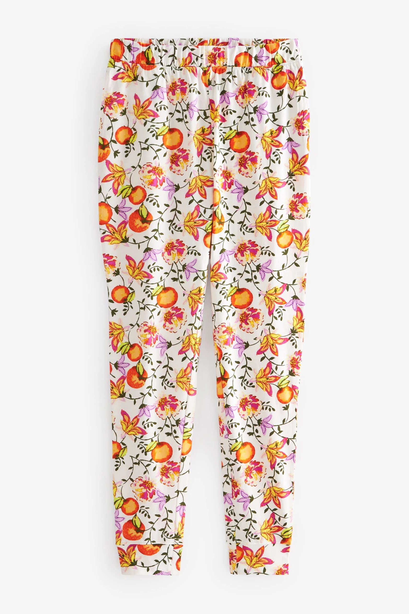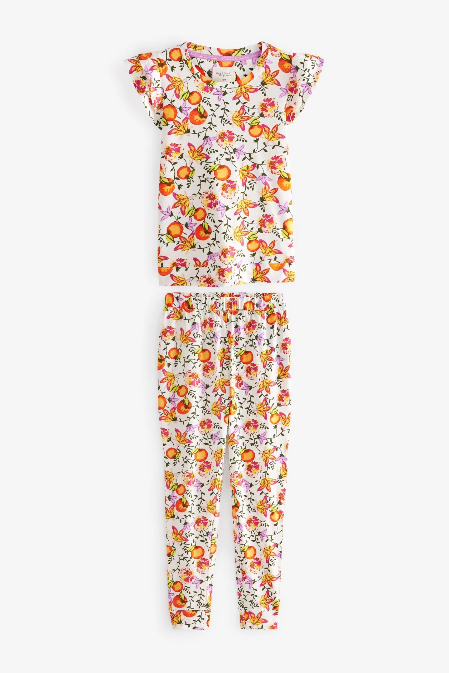 2 Piece set. 100% cotton. Round neck top. Frill detail sleeves. Elasticated waist pyjamas. Cuffed ankles. Allover print.