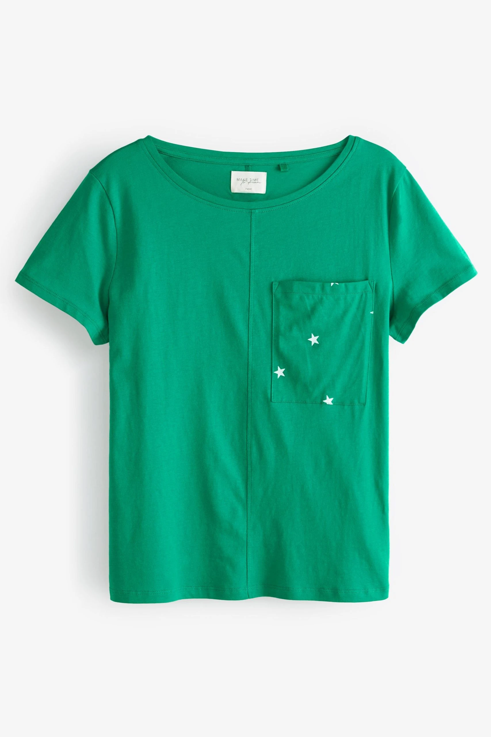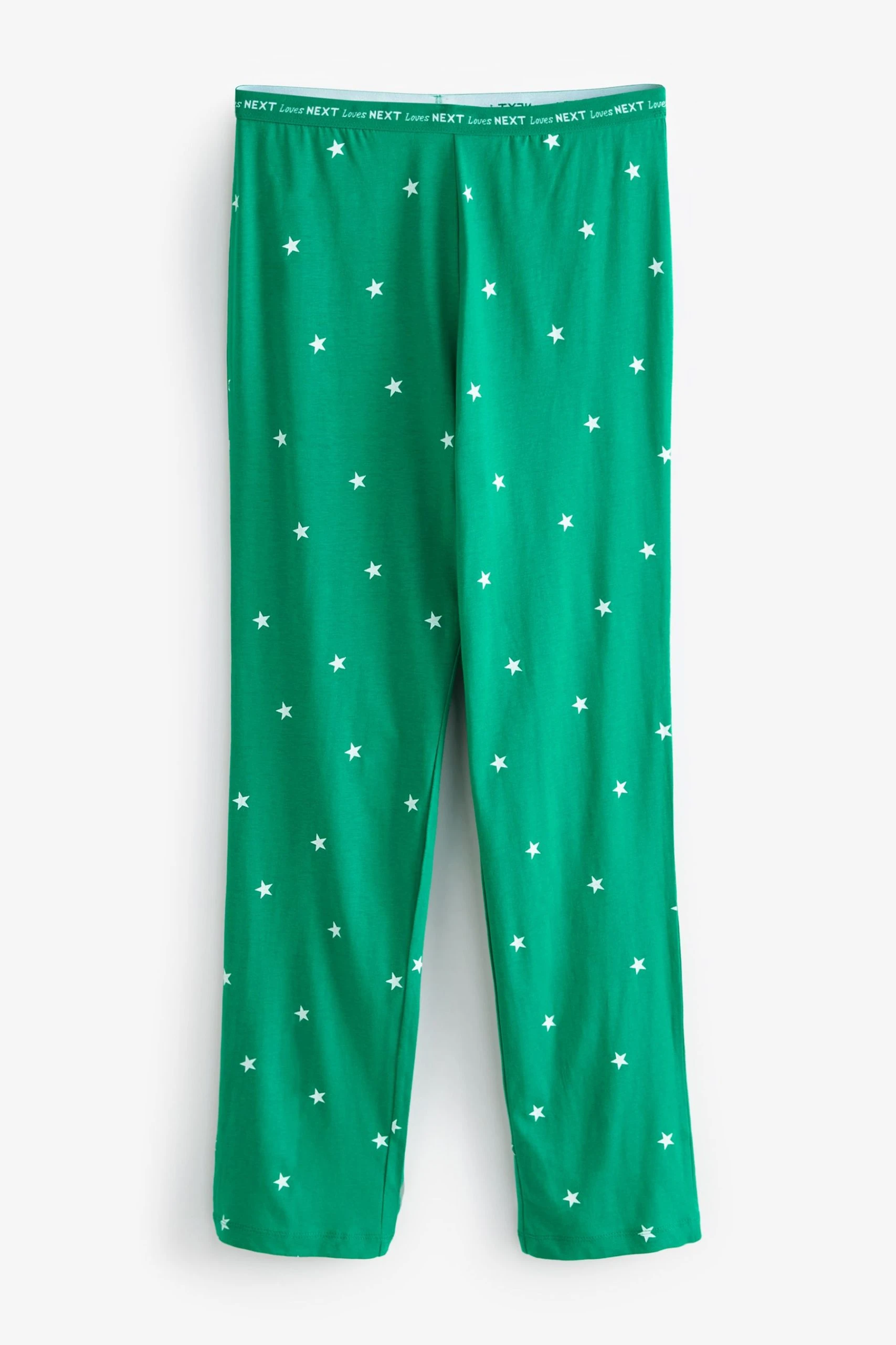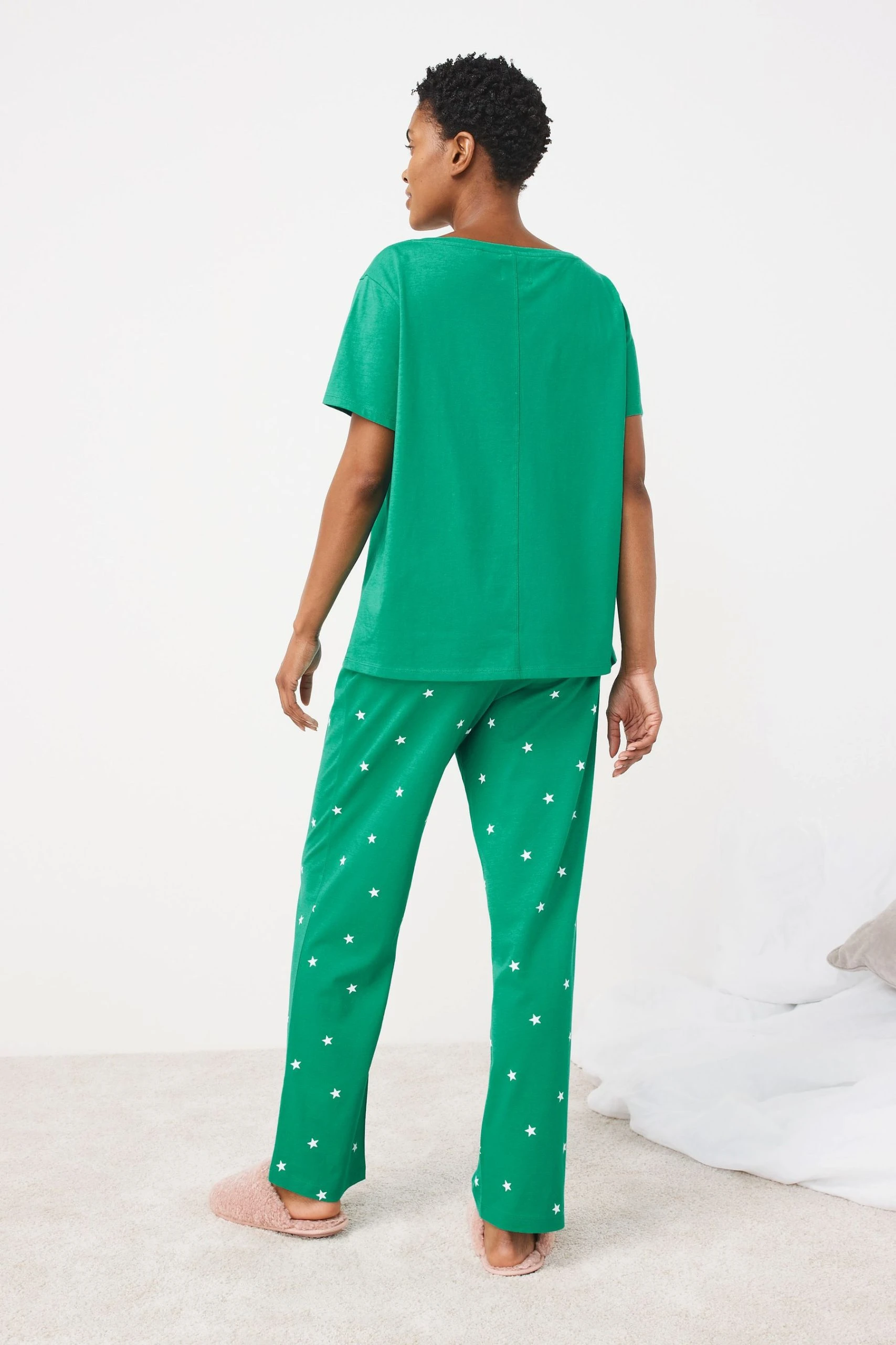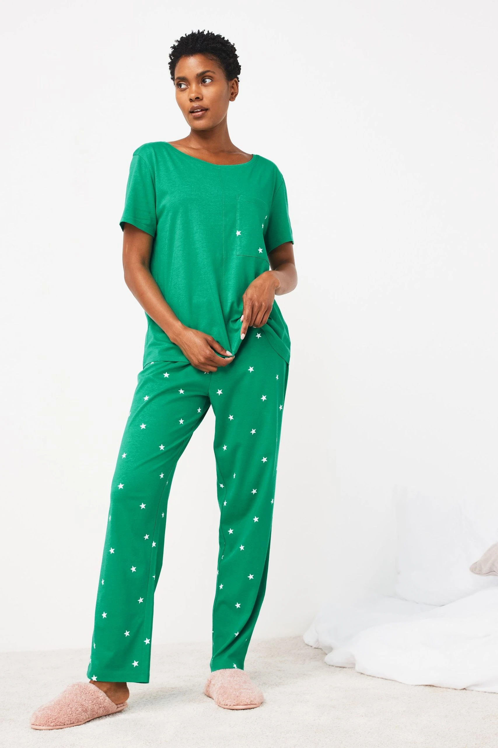 100% cotton. Scoop neckline. Short sleeves. Front side contrast pocket on top. Elasticated waistband. Print patterned pyjamas.