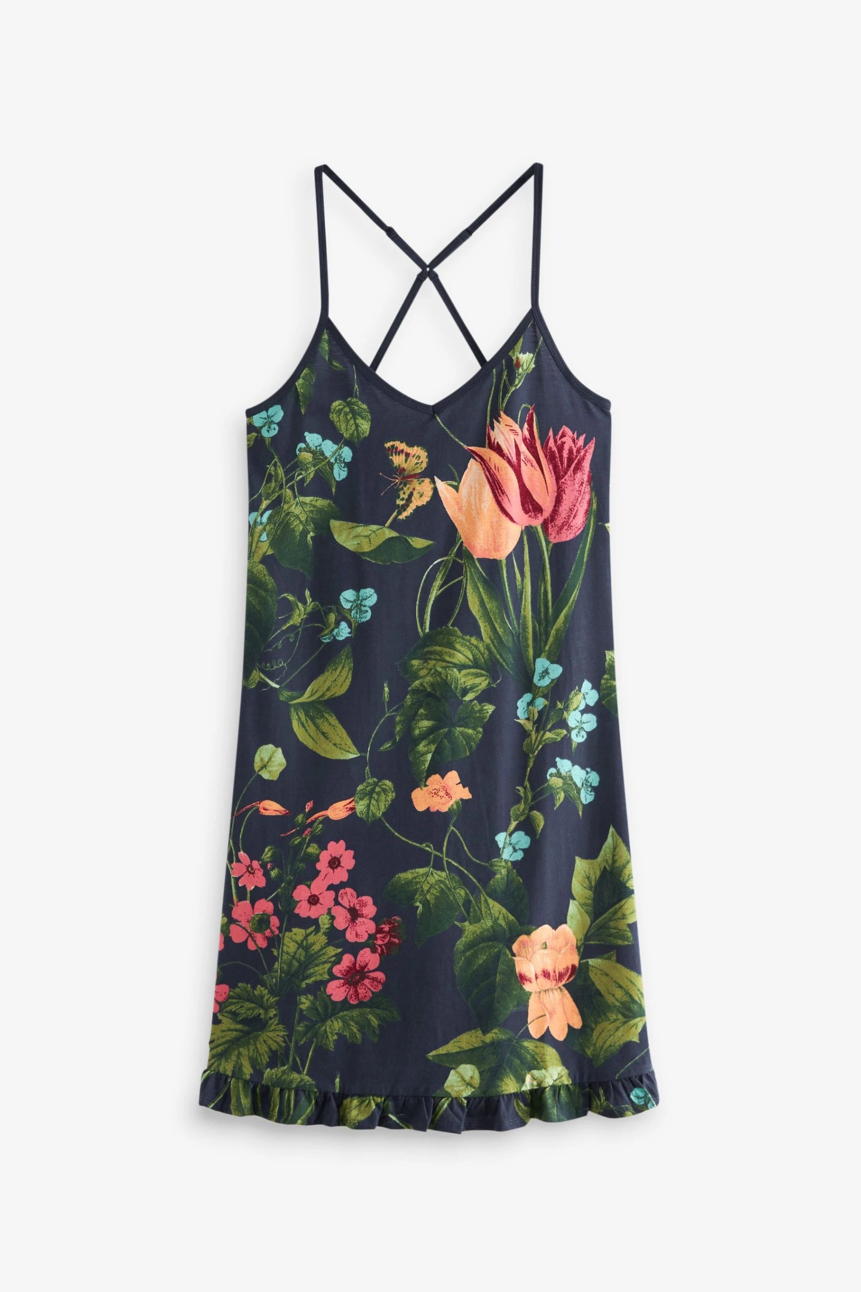 Cotton slip. Allover floral print. Cami straps. Cross-over adjustable back. Frill hem.