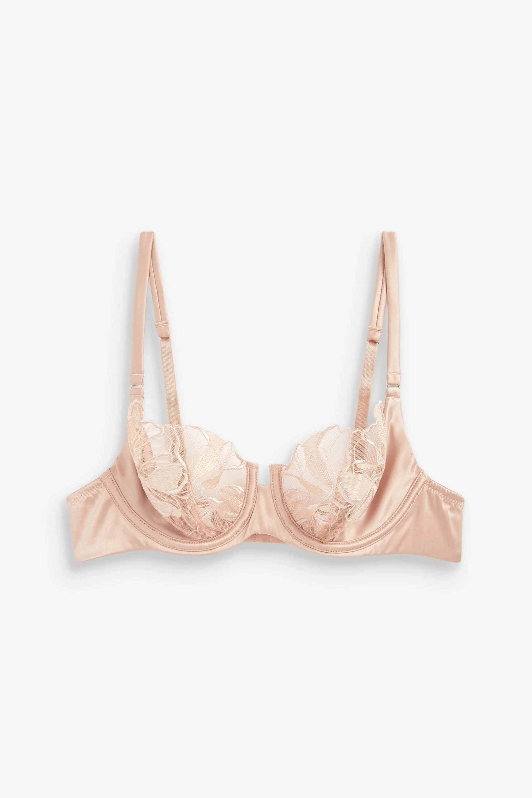This pretty non padded bra is designed in a luxurious satin fabric with floral embroidery detail. In a flattering balcony shape in an underwired or non wired style. Pair with the matching briefs for a co-ordinated look.