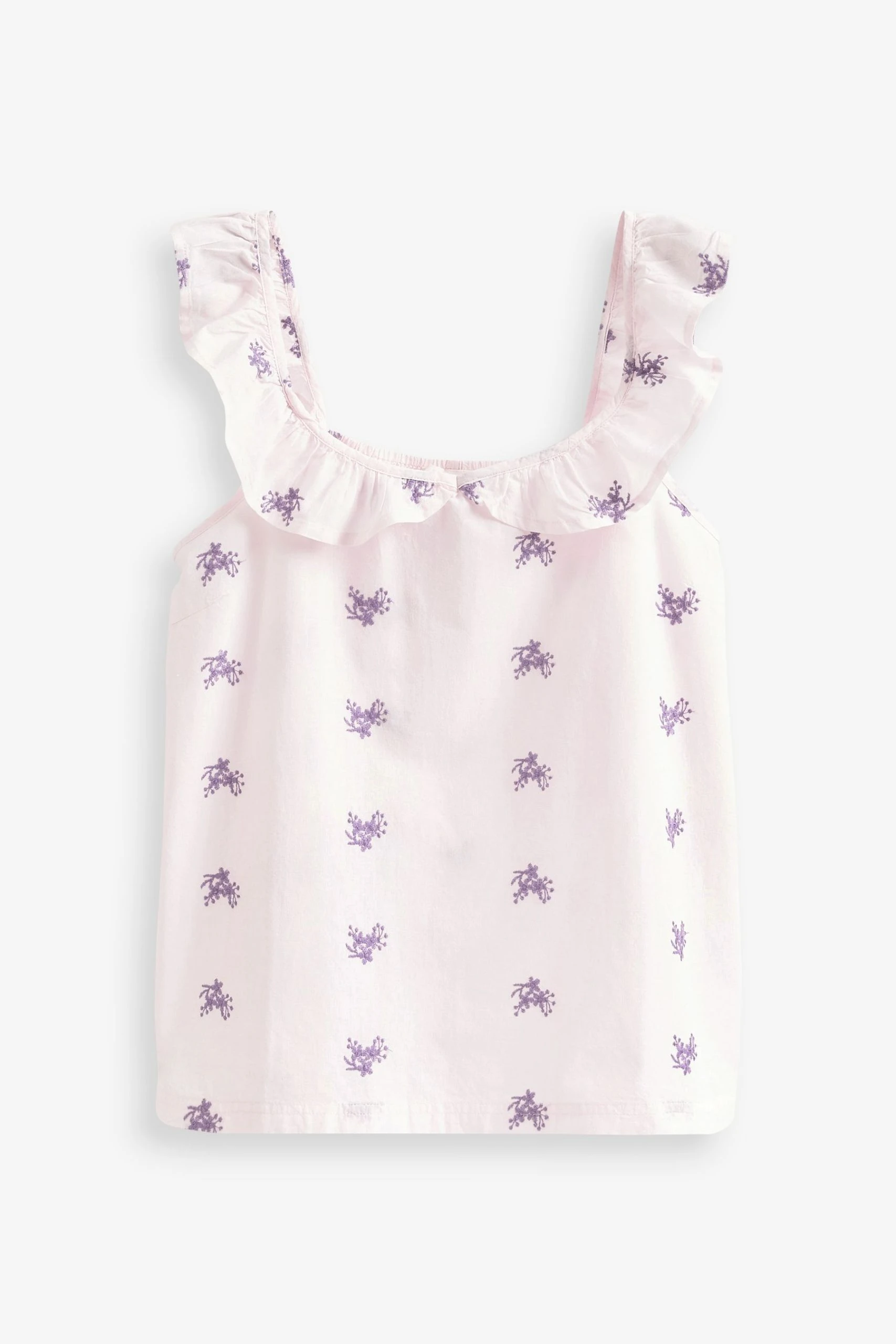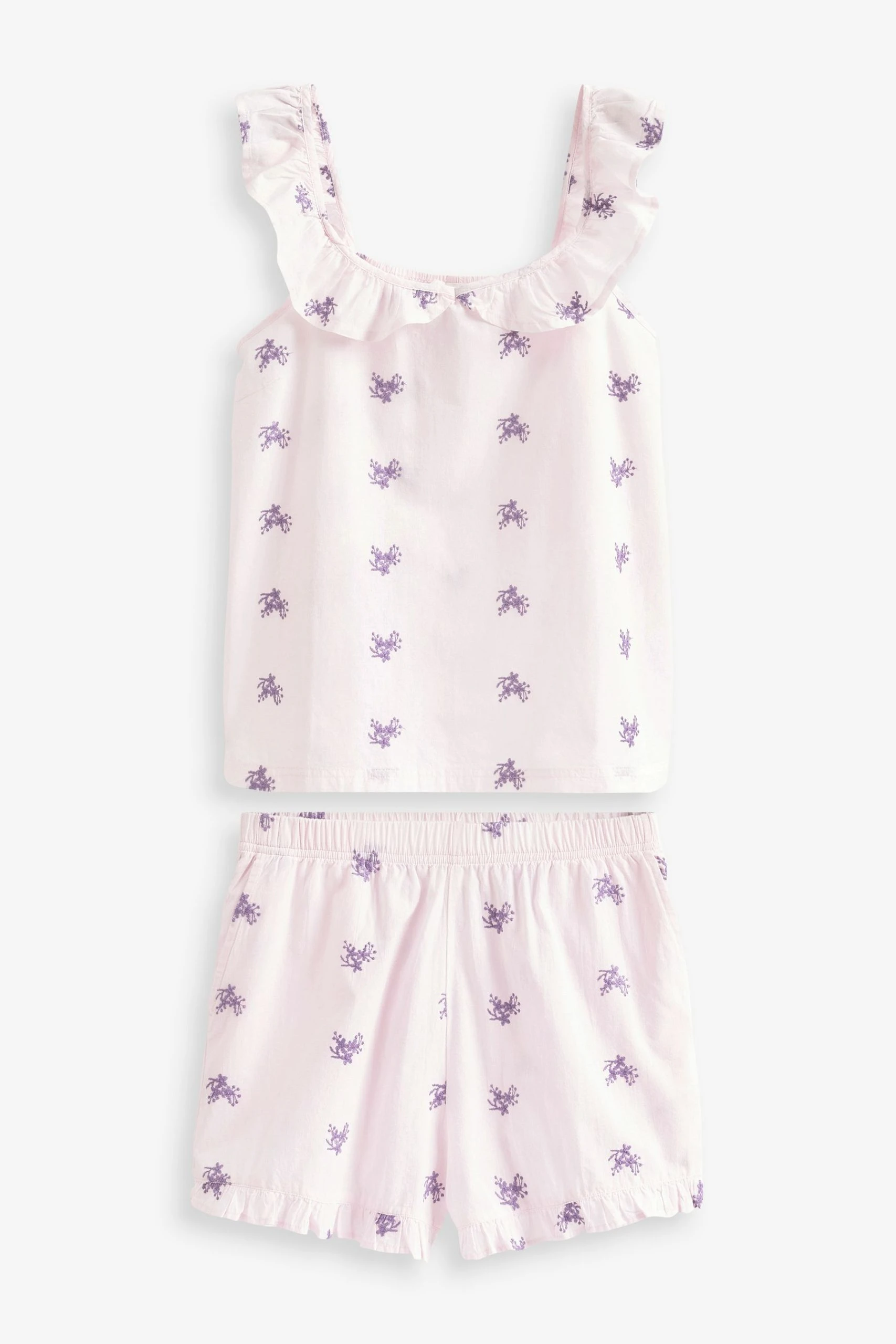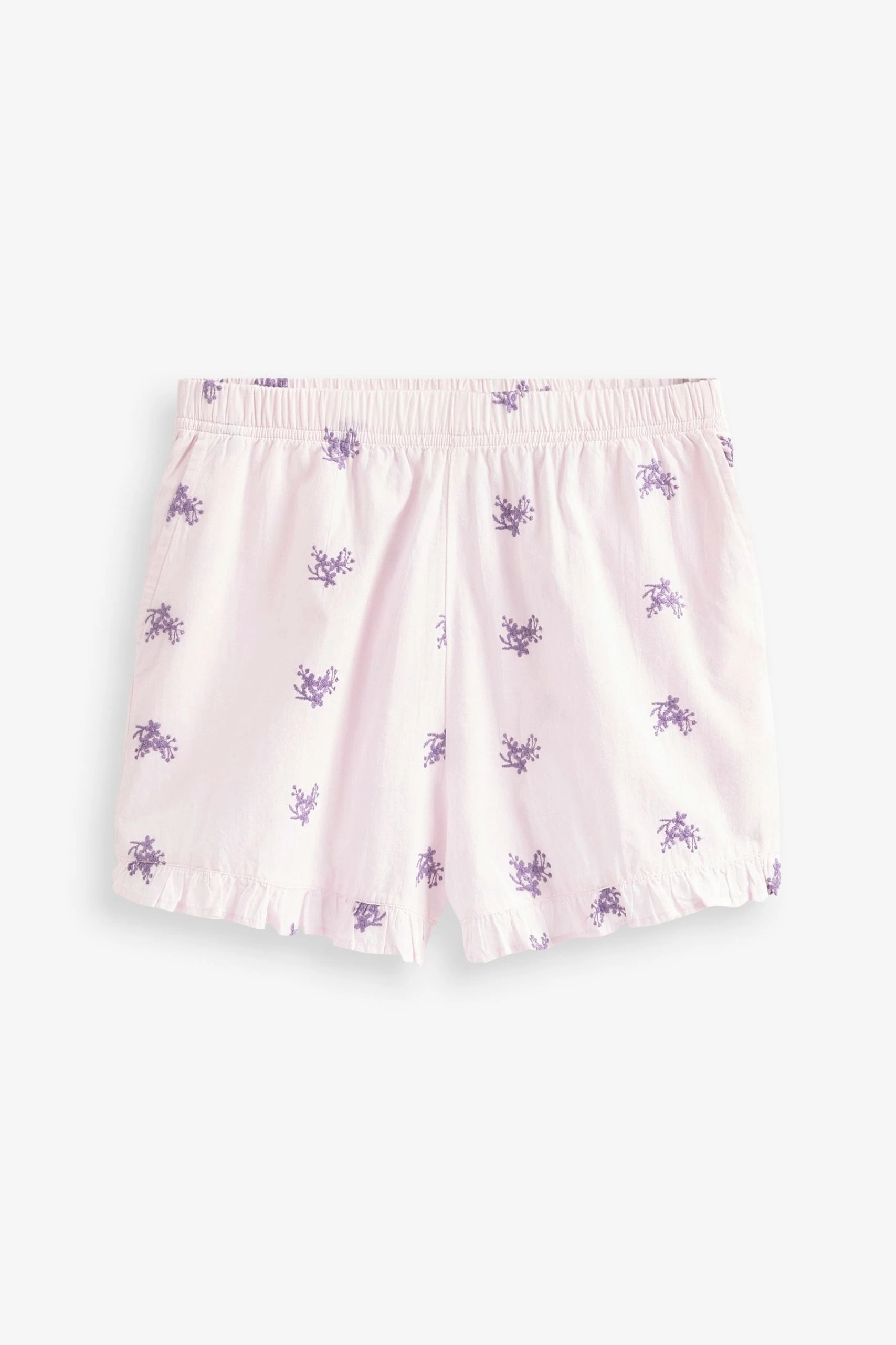 Loose, lightweight cotton pyjamas short set, frill neckline, all-over floral embroidery on top and bottom.