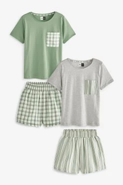 Pack 2 pyjama set. Plain short sleeved T-Shirt. Crew neck. Patch pocket with shorts. Striped and check design shorts. Elasticated waist.