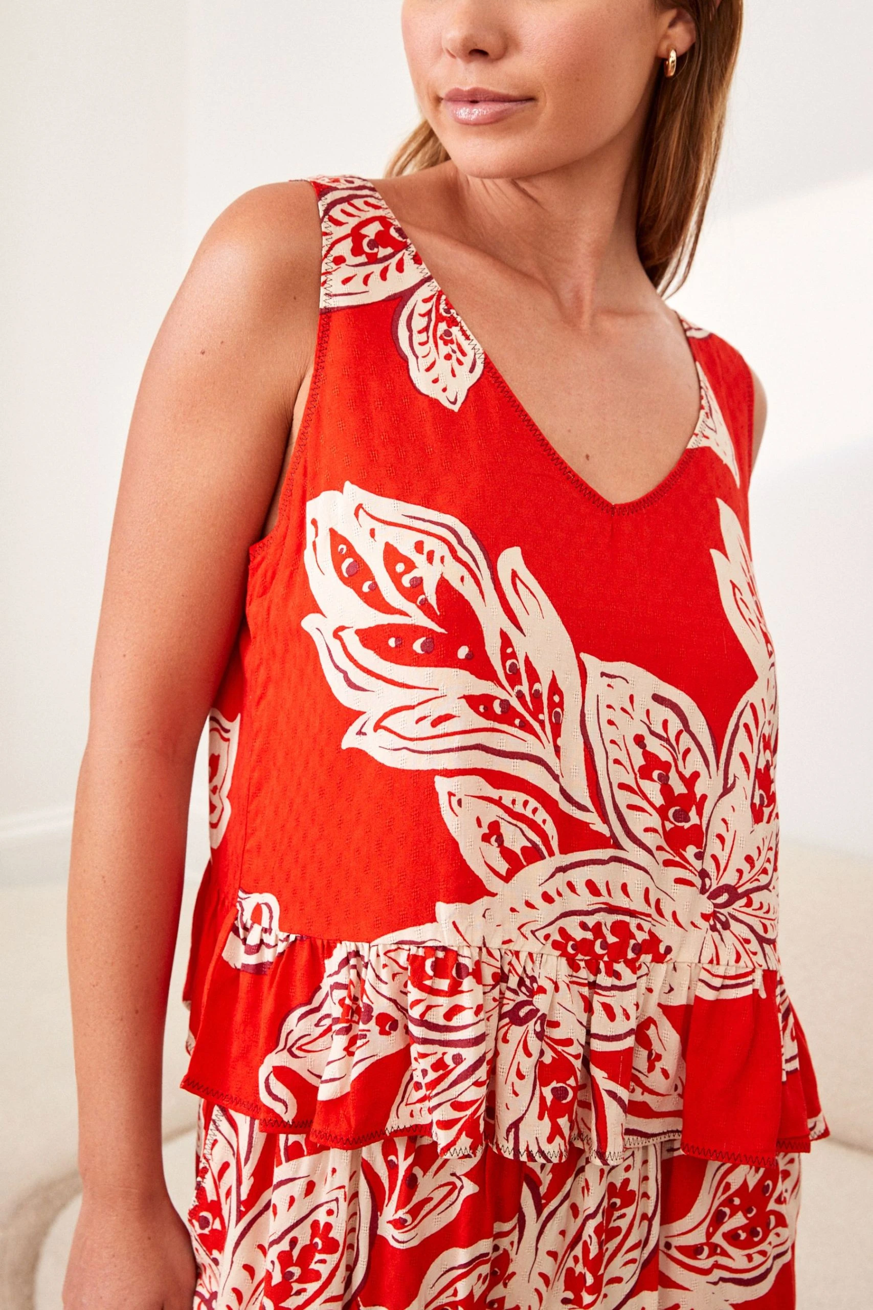 Floral Print. Scoop neck. Sleeveless. Gathered detail. Criss-cross back detail. Loose peplum vest shape. Functional side pockets. High-waisted. Wide-leg trousers.