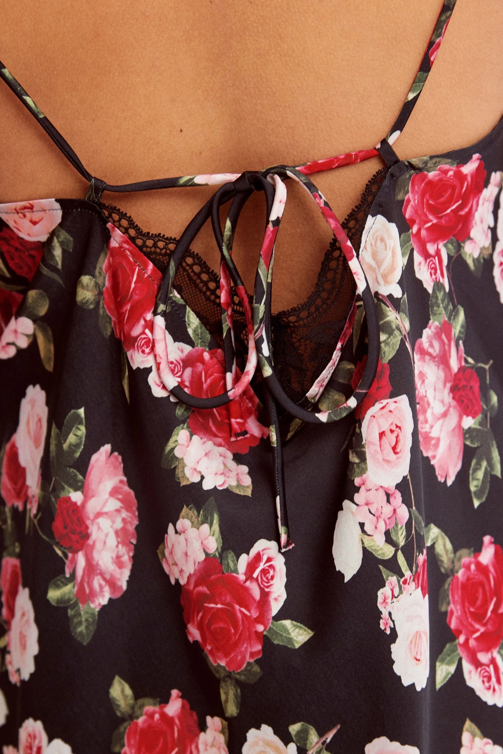 This cowl neck slip is fashioned from a satin fabric with a pretty lace insert to the front. The slip also features tie-back detailing.