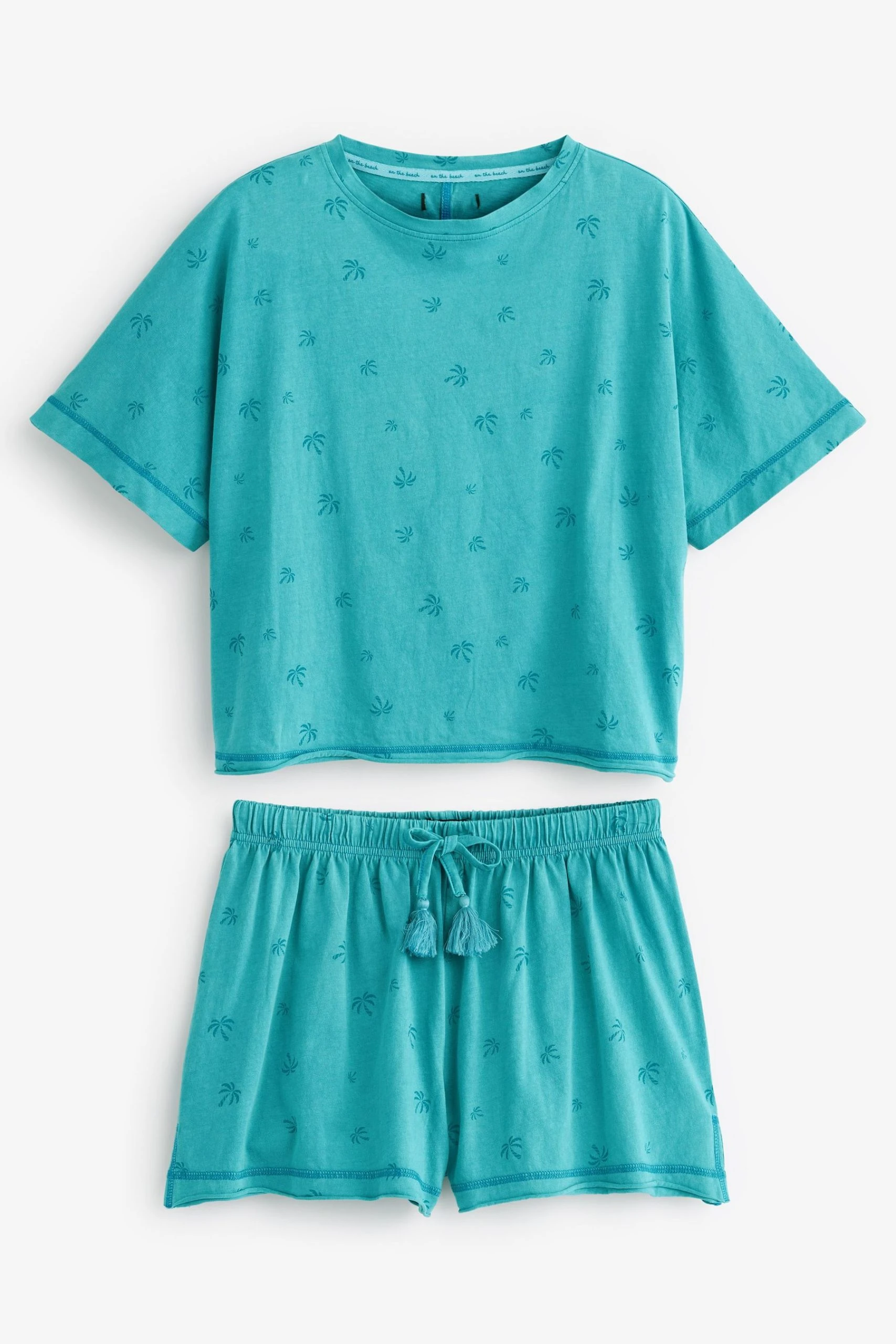 Soft breathable cotton fabric. Crew neck T-shirt. Short sleeves. Elasticated waistband shorts. Drawcord with tassel detail. Palm tree prints.