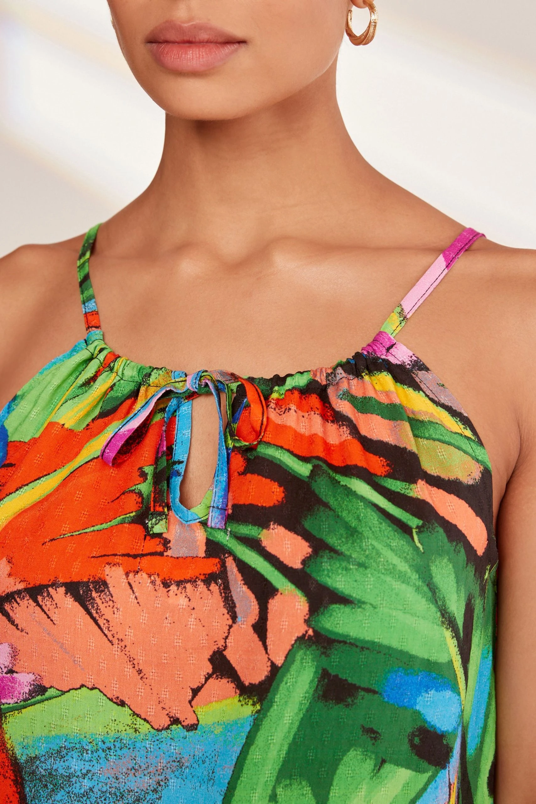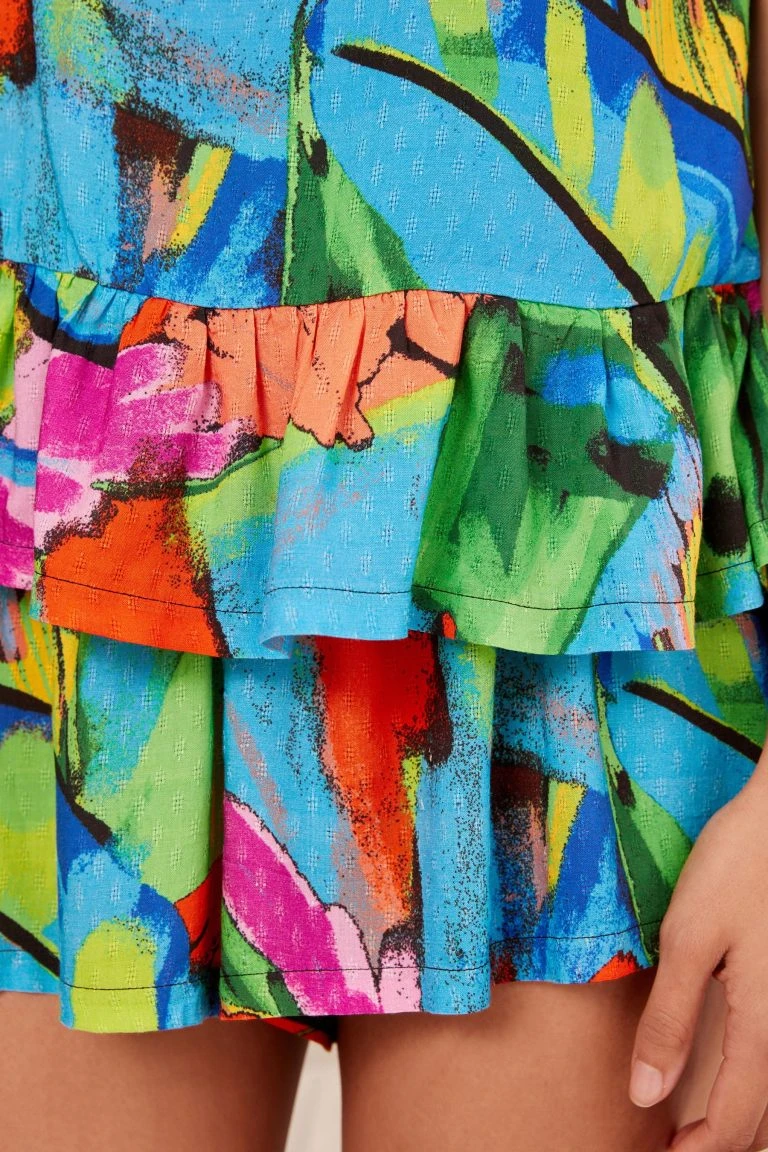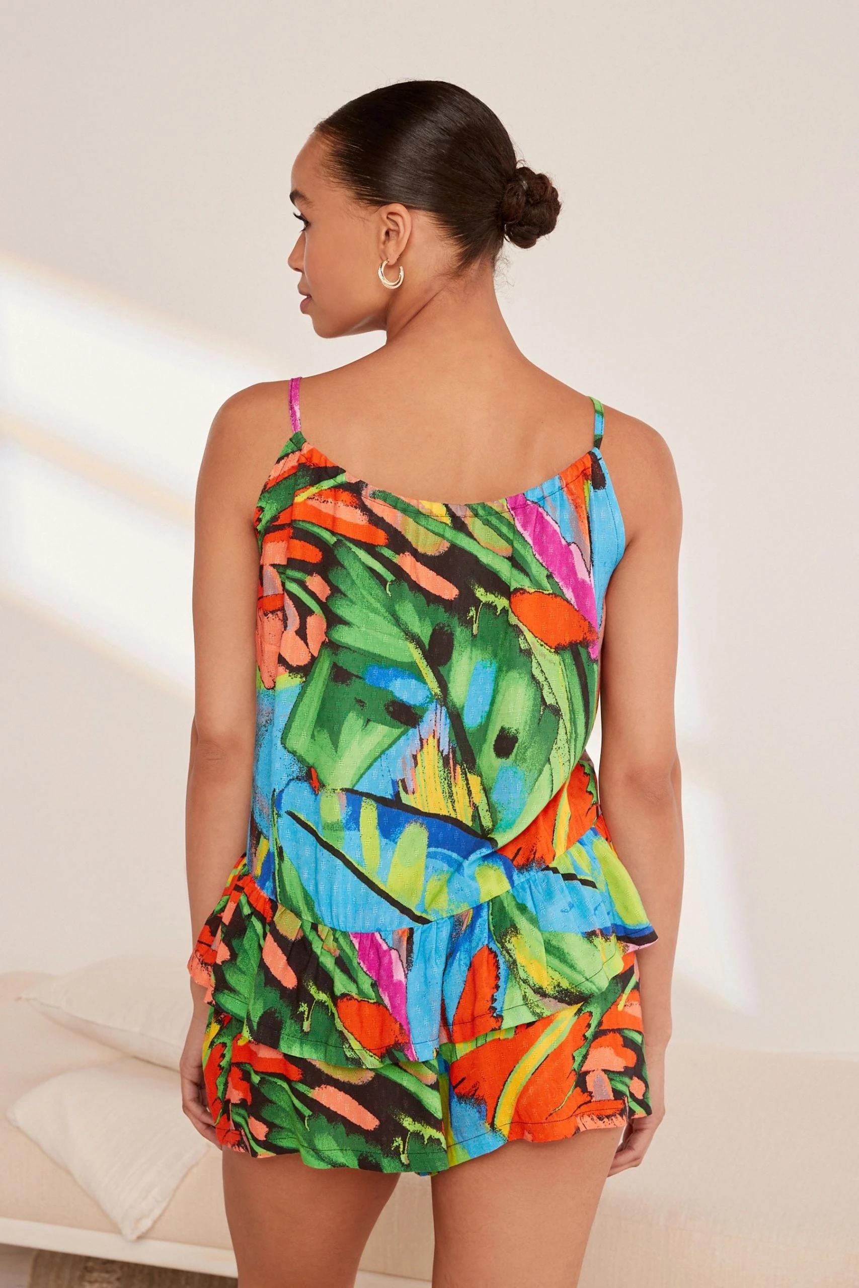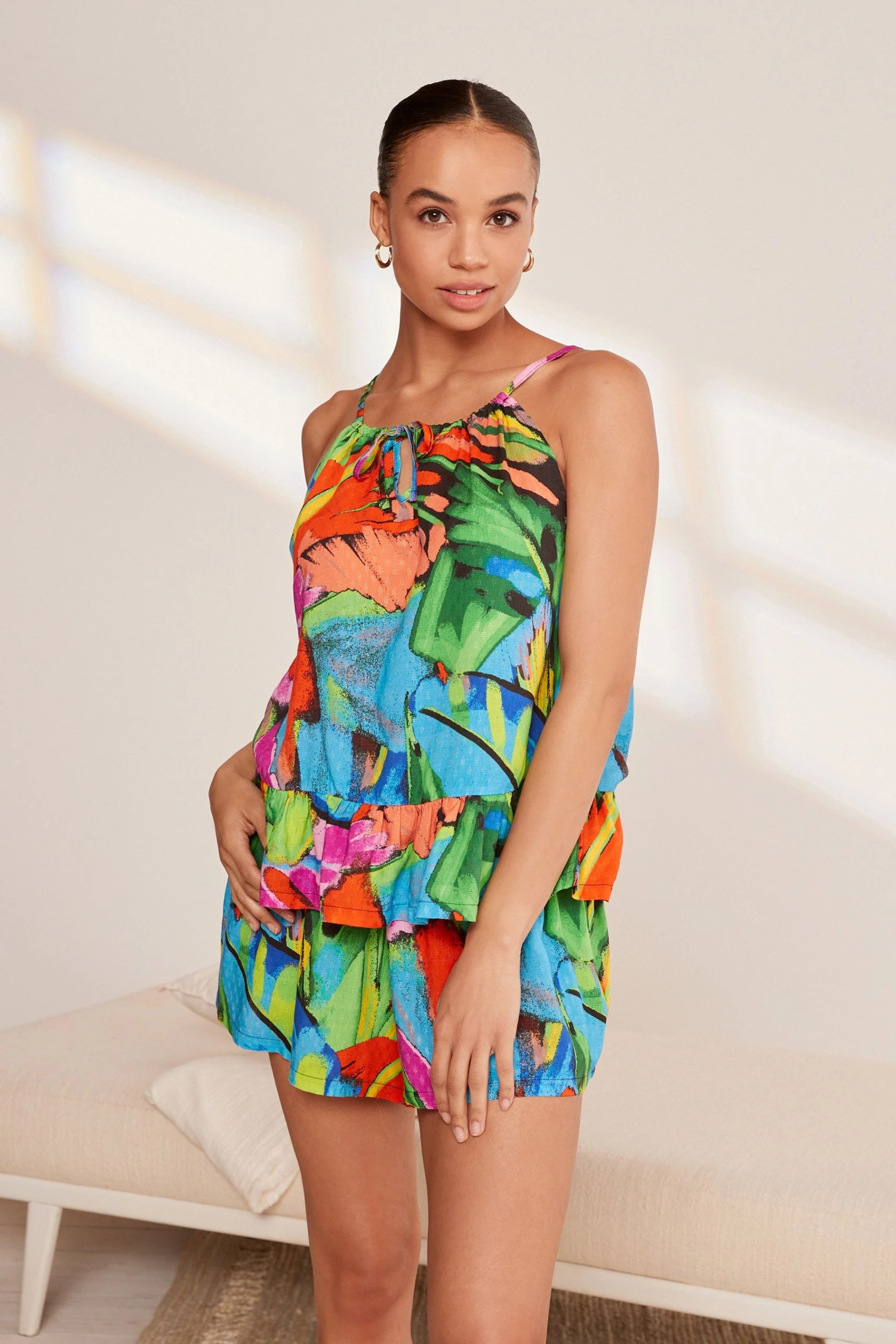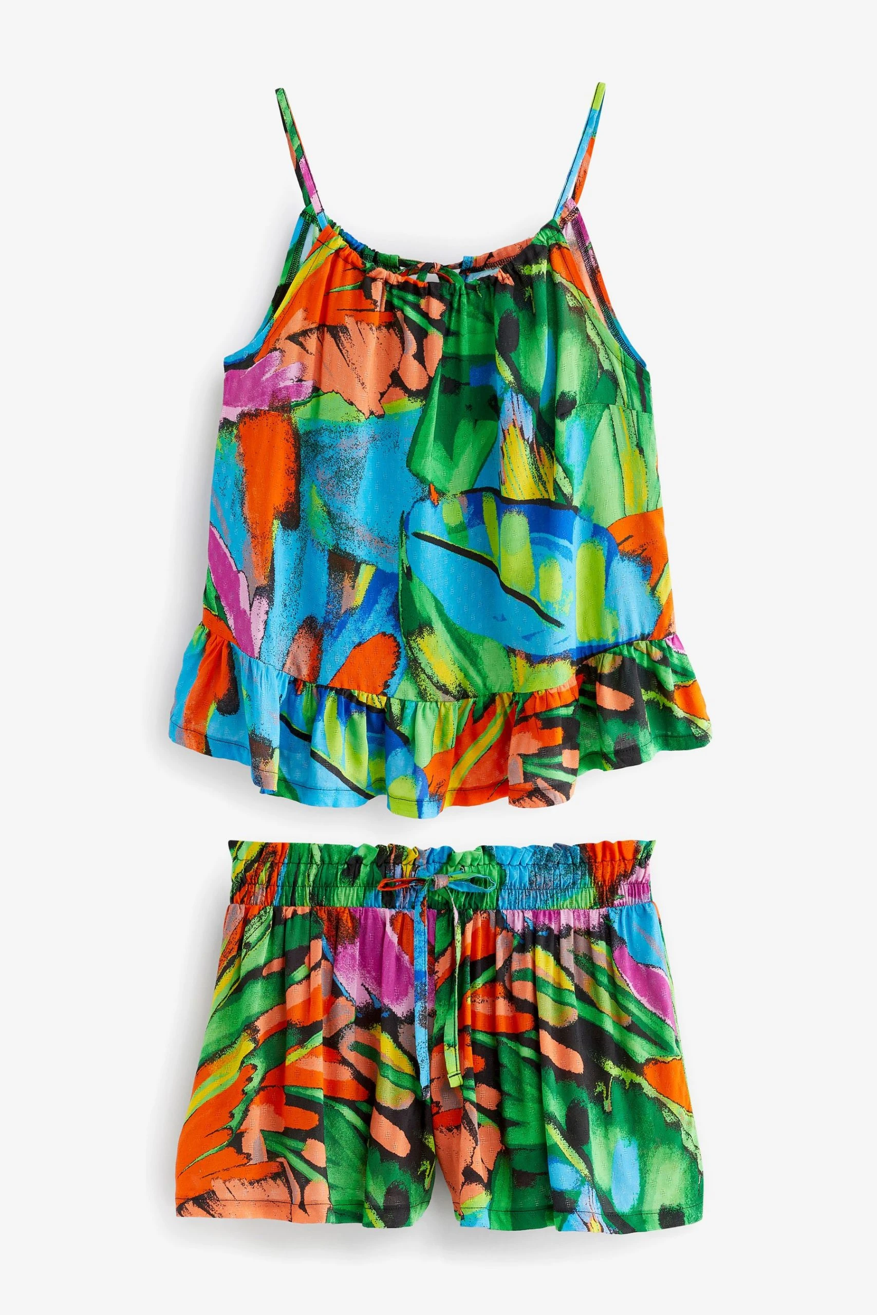 Relaxed fit. Tiered cami top. Adaptable straps. Tie detail at front. Elasticated waist shorts with drawcord. All over print.