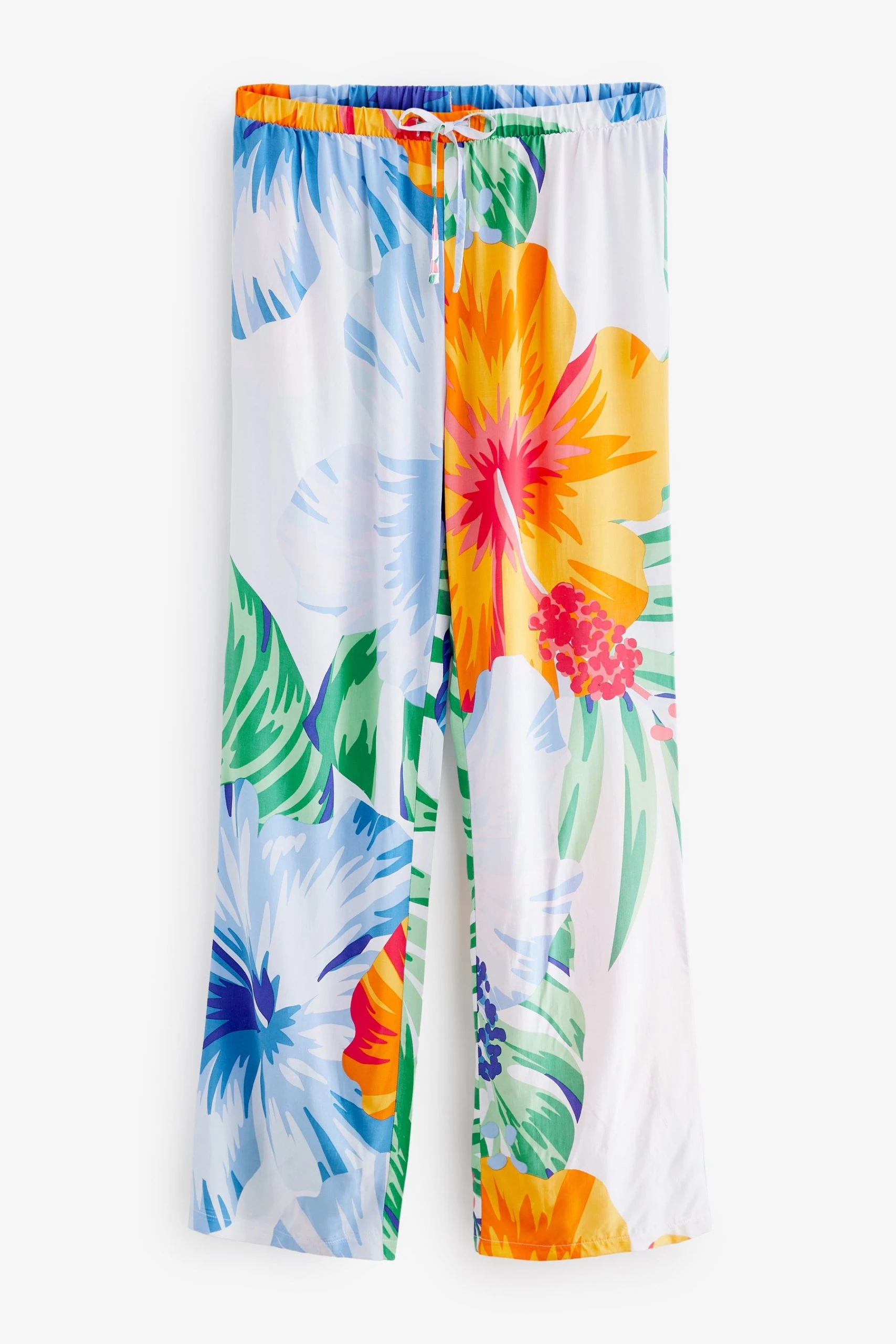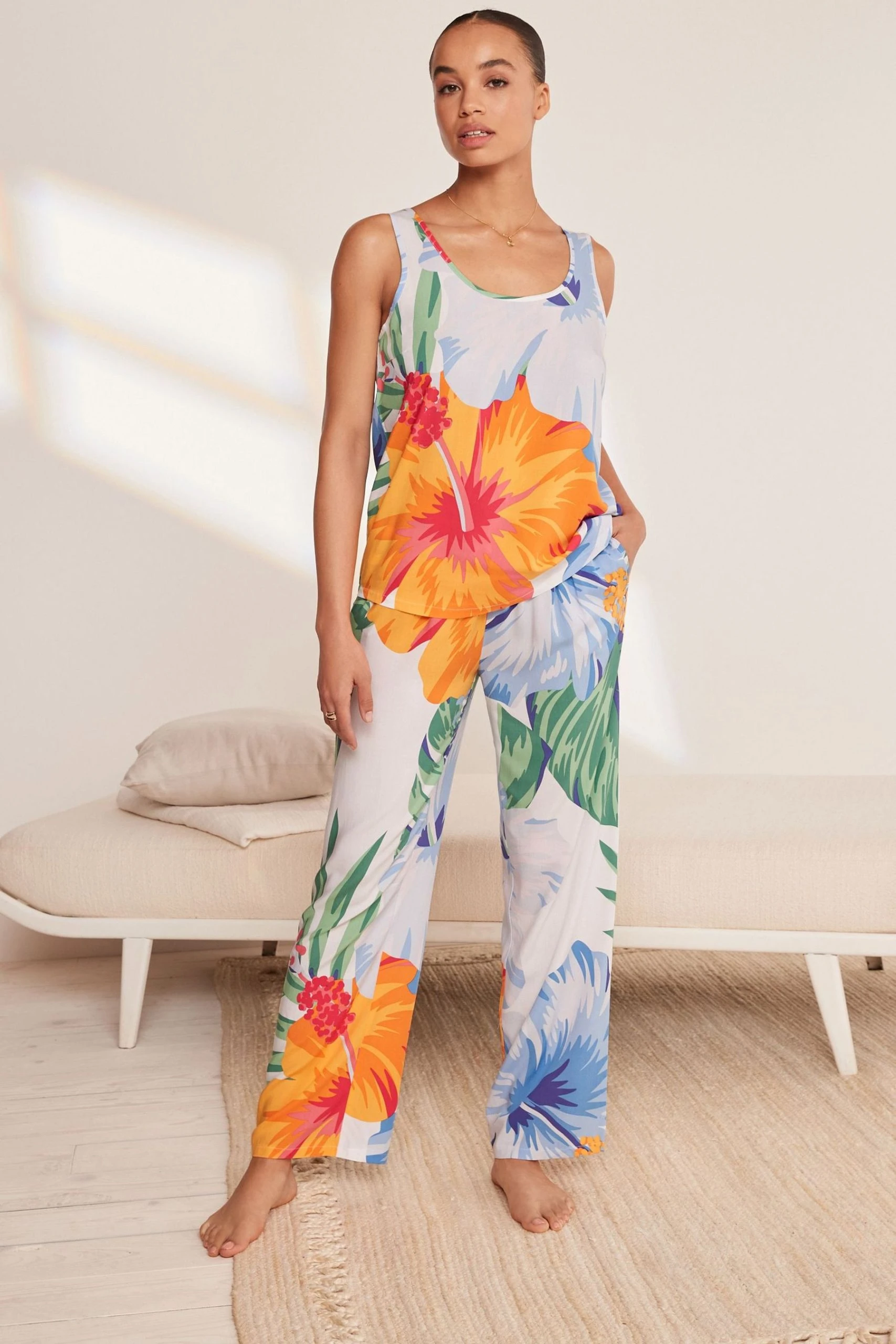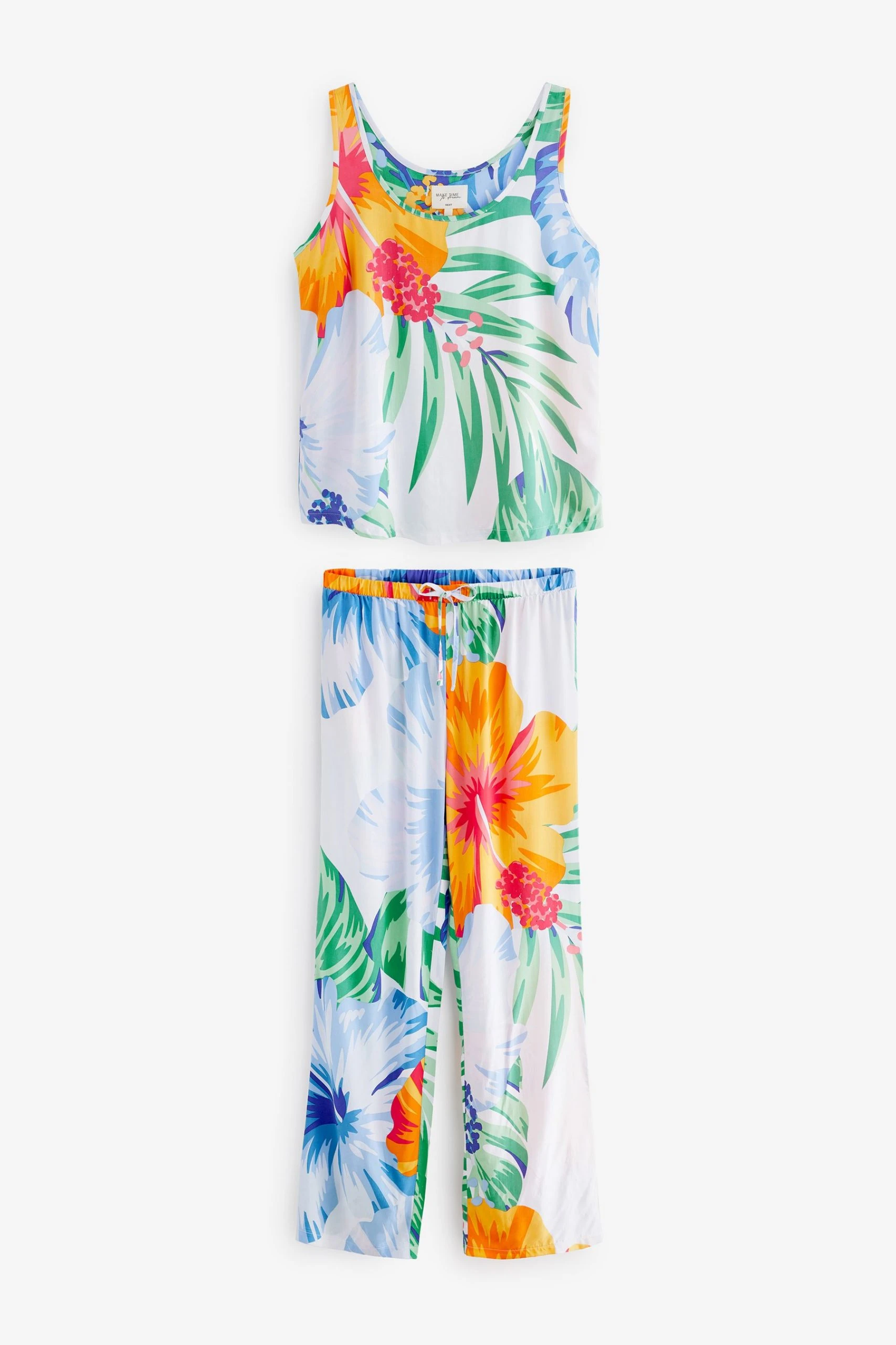 Lightweight fabric. Relaxed fit. Sleeveless vest top. Scoop neck. Long length pyjamas. Elasticated waistband with drawcord. Side slip pockets. All over monochrome abstract print.