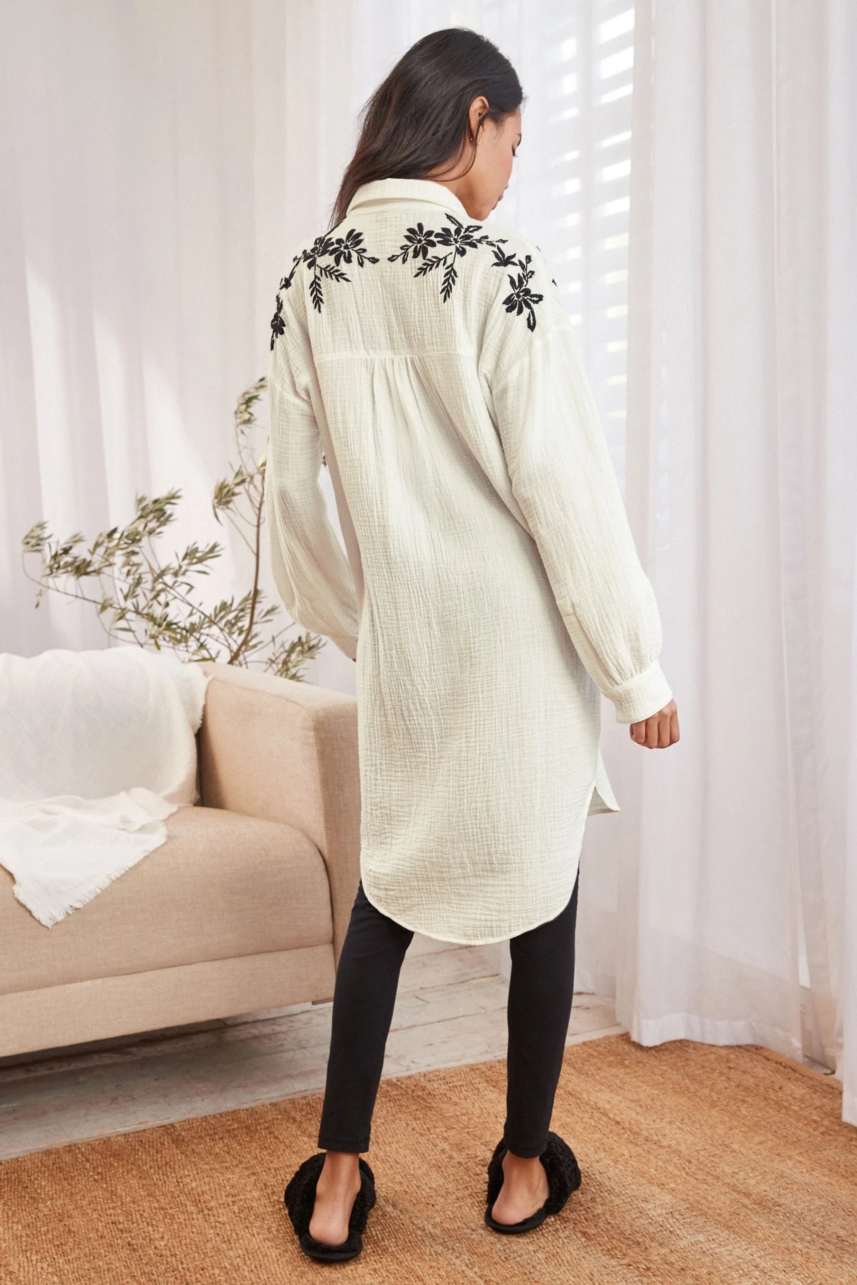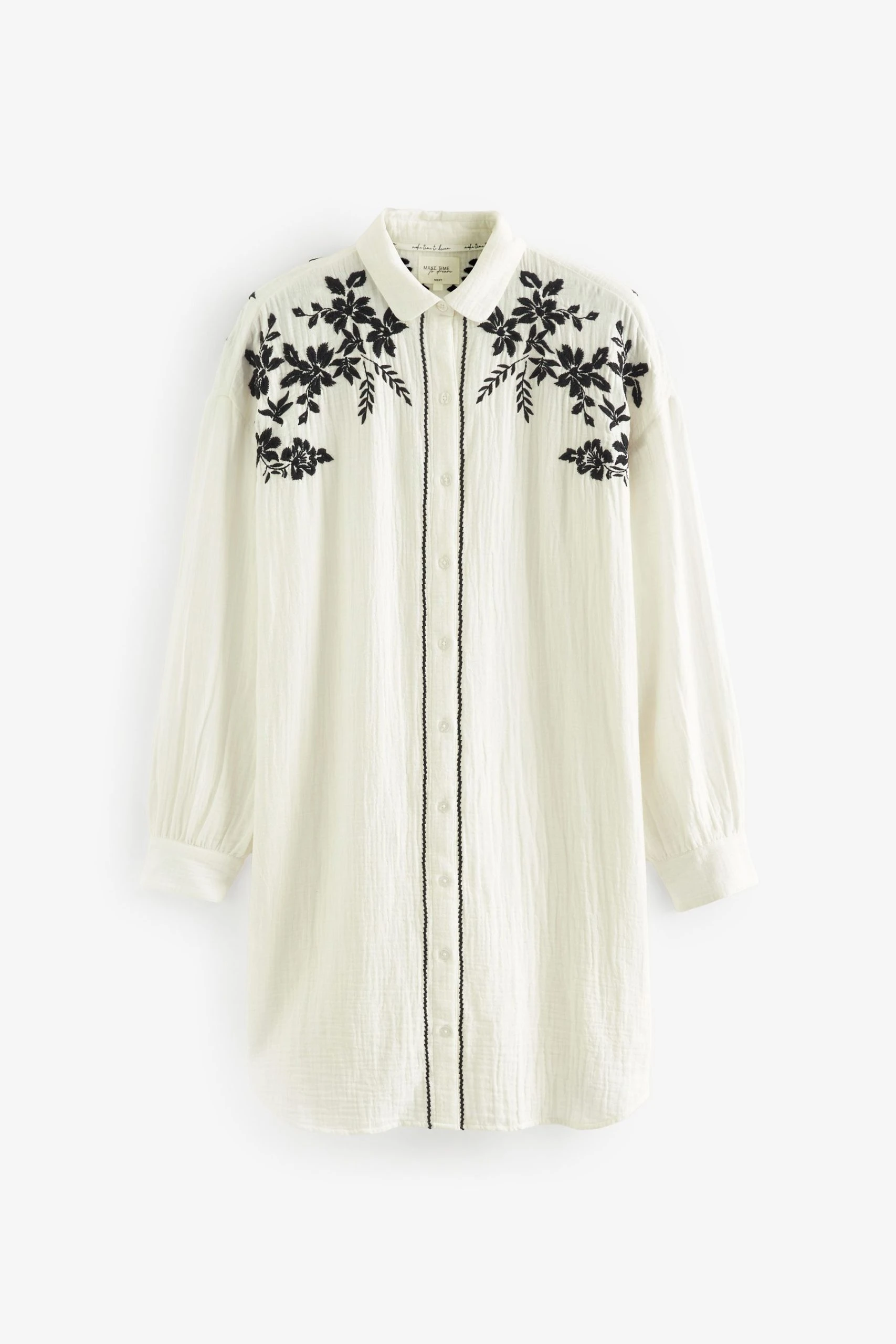 Embroidery detail on shoulders. Relaxed fit. Button fastening. 100% Cotton. Long cuffed sleeves. Collared neck.
